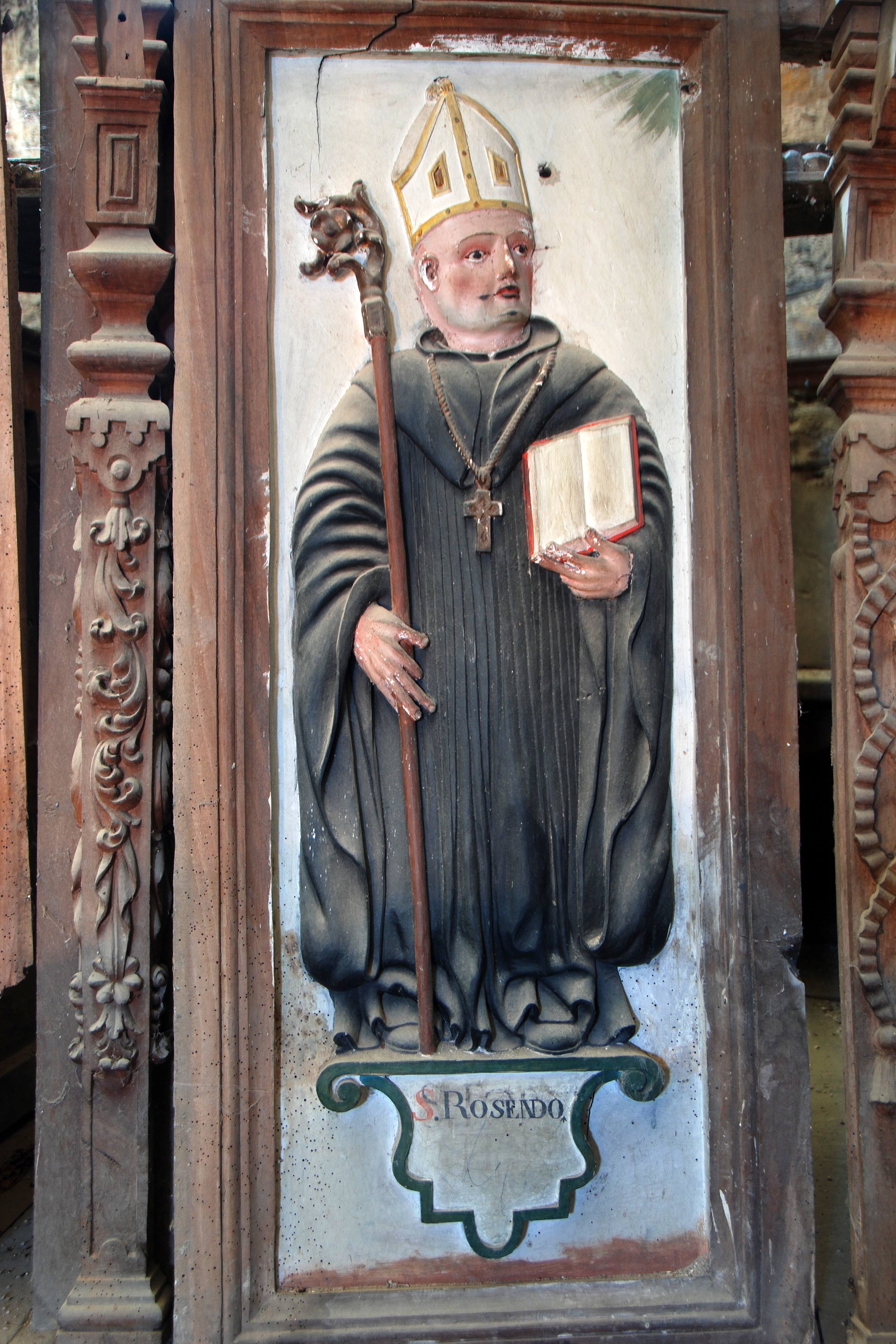 FFigura en mediorelieve sobre una peana (también en mediorelieve) en la que el protagonista es identificado por su nombre: “S. ROSENDO”, san Rosendo. El fondo de la composición es blanco. Se representa de pie y de frente, con la cabeza ligeramente ladeada y la mirada perdida, y porta atributos episcopales (mitra, báculo, y una cruz en el pecho), así como con libro abierto en su mano izquierda. Viste hábito benedictino, rico en plegados. Viste hábito benedictino, rico en plegados. Un rudimentario fulgor verdoso asoma desde el ángulo superior derecho (según se mira) de la composición.