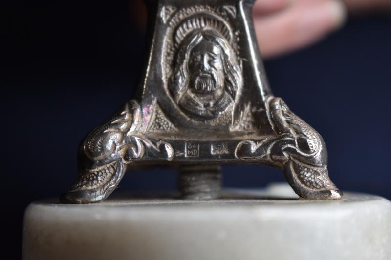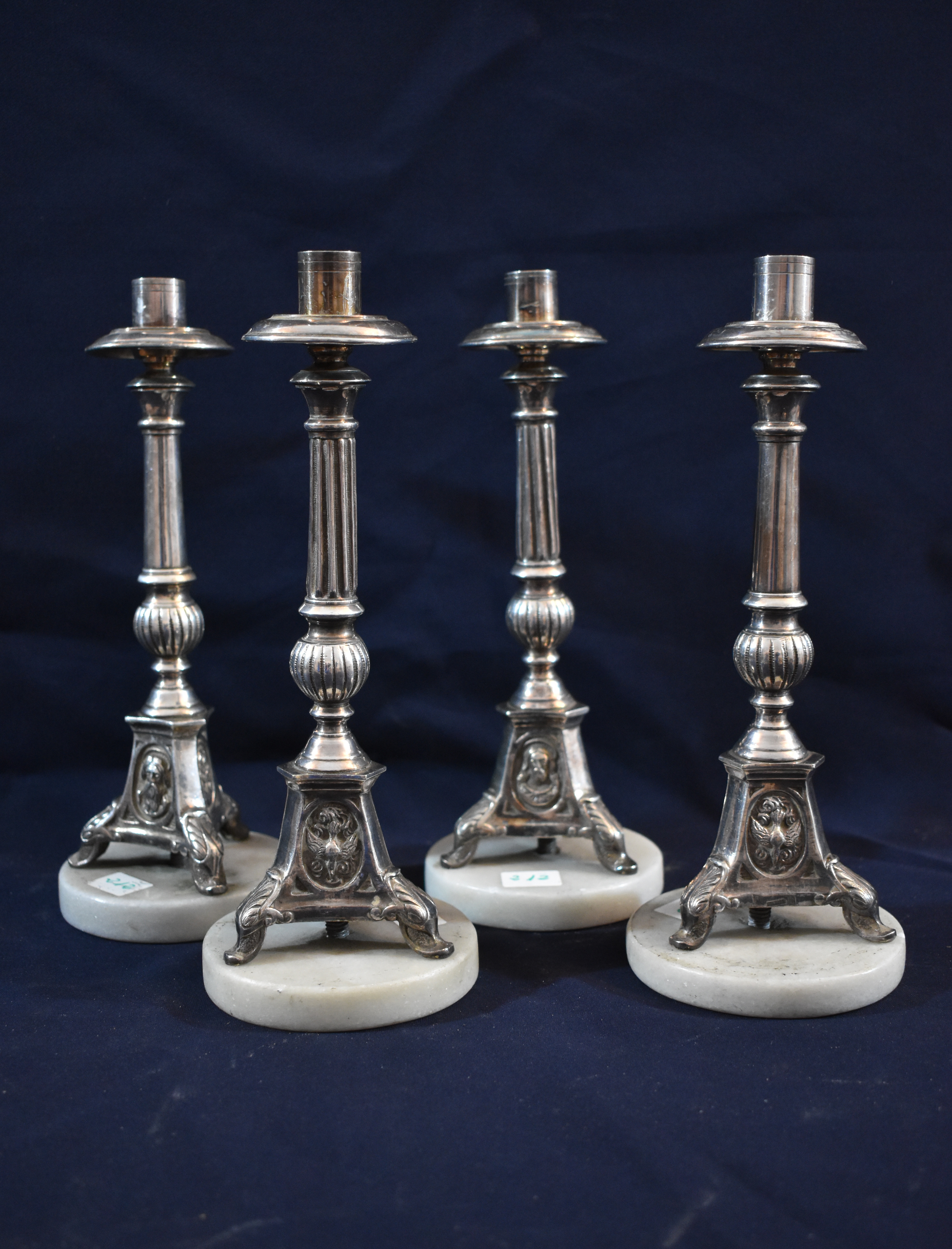 Candeleros de tipo industrial de base triangular sobre pies vegetalizados con medallas en sus laterales, astil abalaustrado y mechero cilíndrico con pestaña moldurada y saliente. Siguen los modelos más habituales de los talleres Meneses.