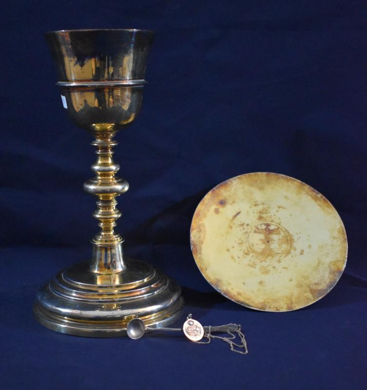 Completa el juego una patena, elaborada igualmente en plata dorada, con borde liso y campo con cruz sobre el Calvario inscrita en dobles círculos grabados. Por último, se acompaña de una pequeña cucharilla de metal, de cronología posterior.