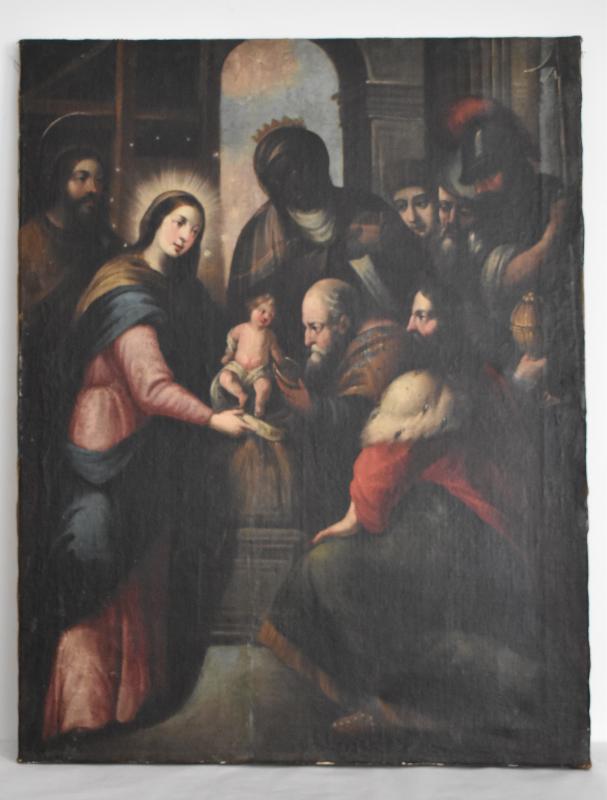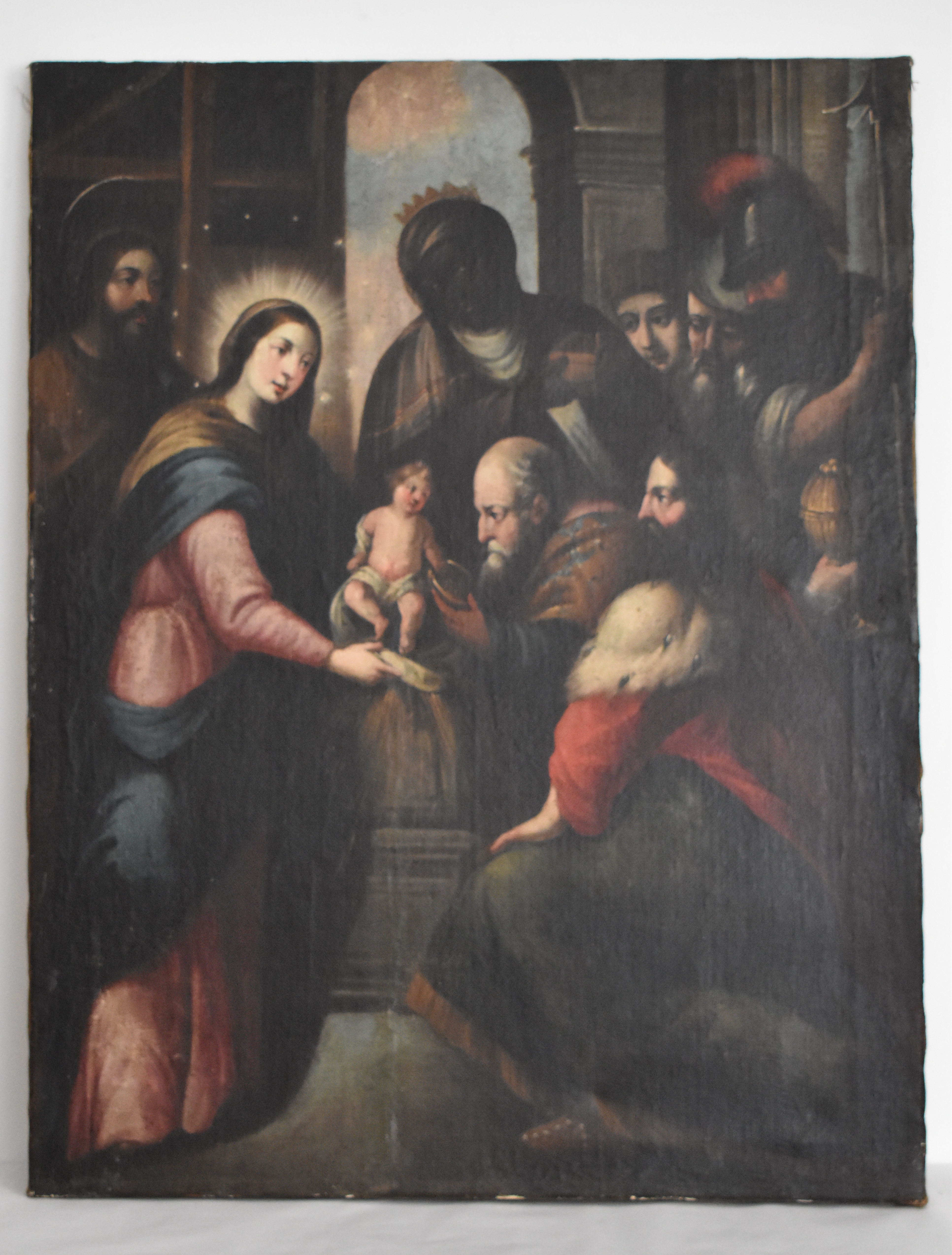 Dentro, nueve personajes llenan el espacio, de los que se iluminan por entero la Virgen y el Niño, la faz de Gaspar y el armiño de Melchor, que se arrodilla ante la criatura que la Madre, de pie, le presenta.