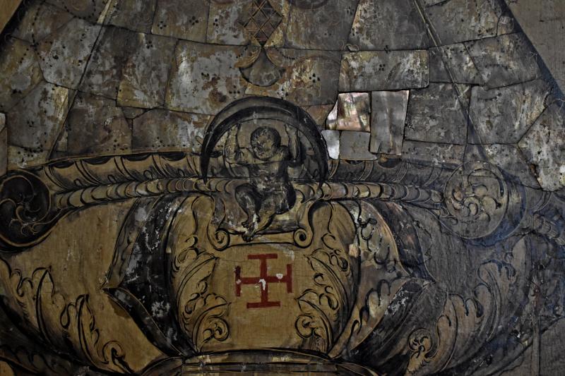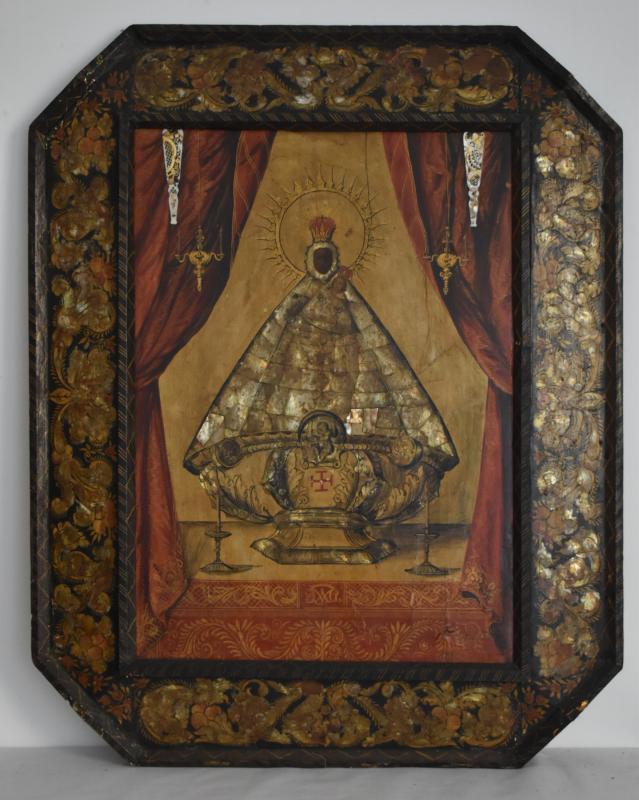 Lo extraordinario de la obra son las incrustaciones de nácar, que copan por entero el frente del ampuloso manto virginal y la mayor parte del marco, que se decora con abigarrados conjuntos florales, enteramente de nácar.