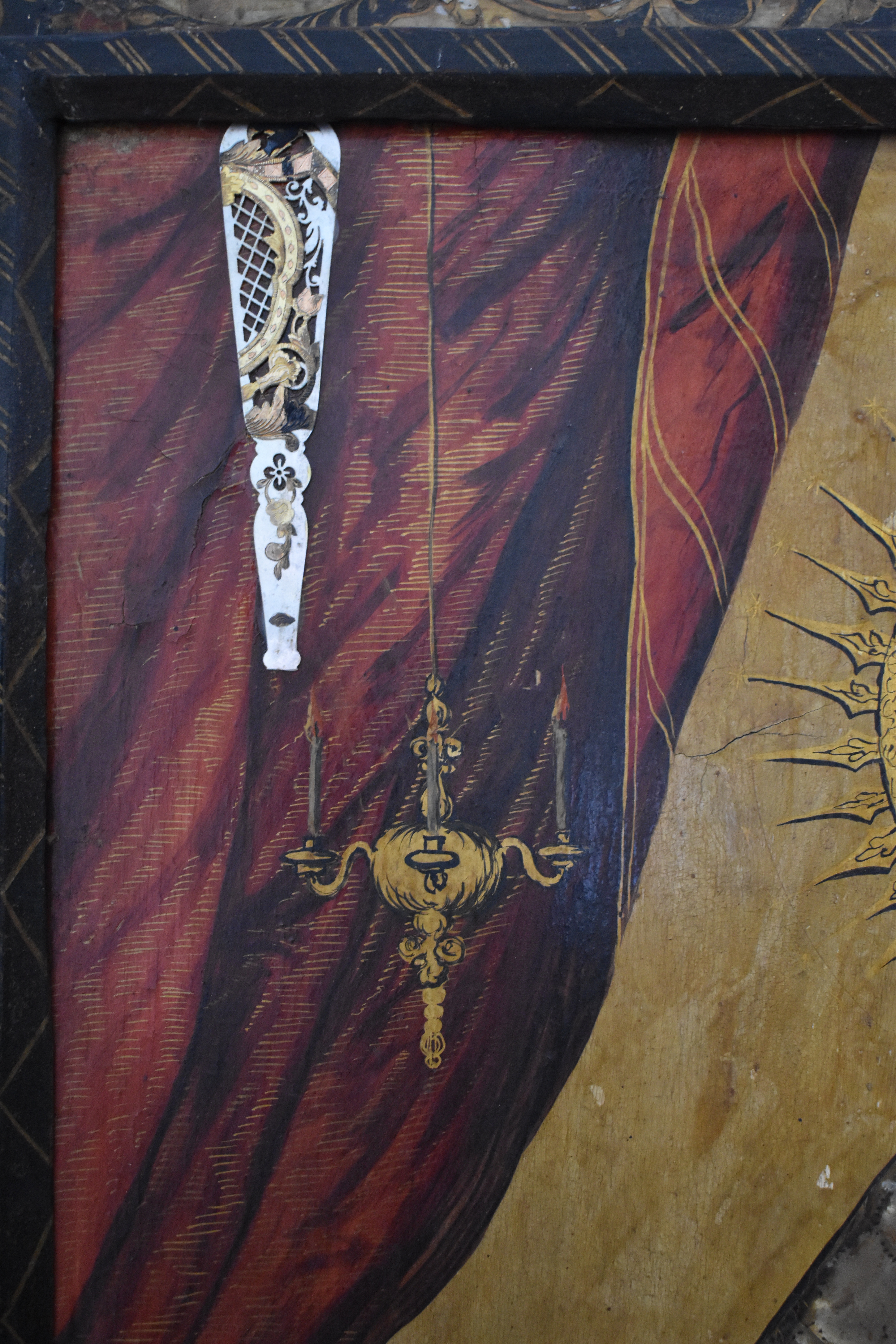 Tabla con la representación de una Virgen con Niño sobre ostentosa peana (con cruz potenzada) que sigue los modelos distribuidos para la piedad popular en múltiples grabados con leves cambios para representar vírgenes locales.