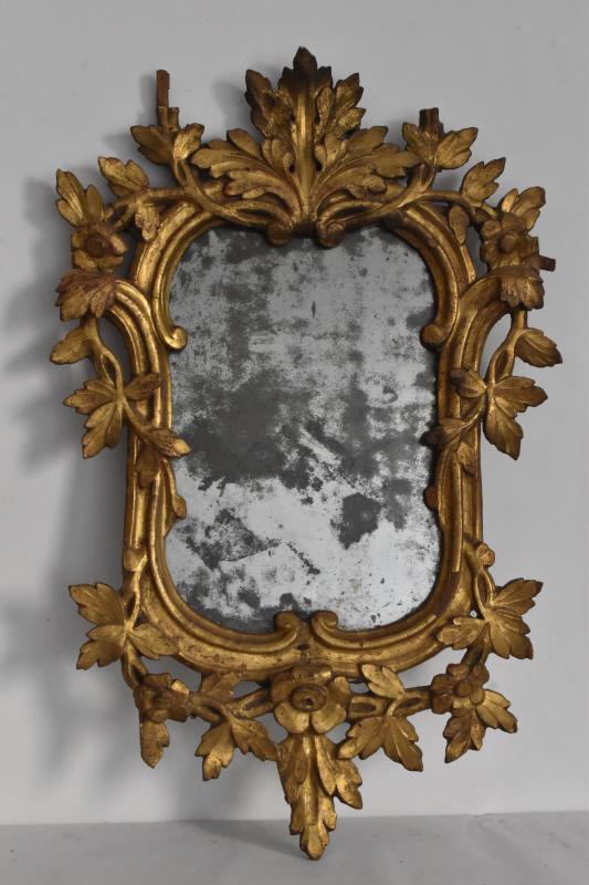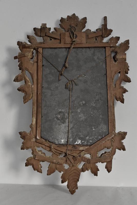 Espejo con marco a modo de cornucopia, no estrictamente simétrico, decorado con salientes hojas y tallos. En la parte superior ha perdido una guirnalda floral calada. La inferior, también de hojarasca, remata en pico.