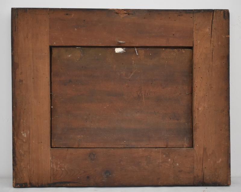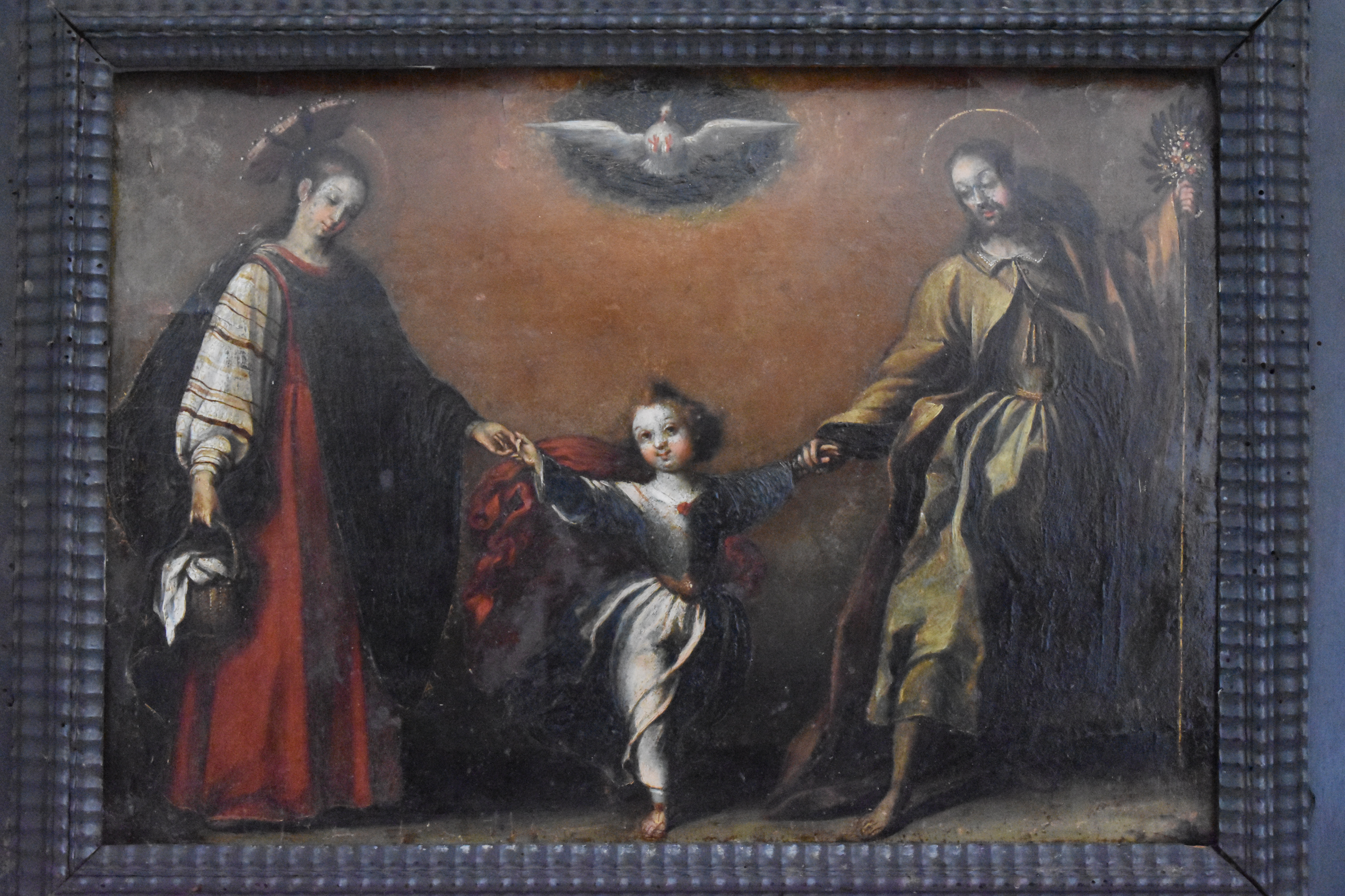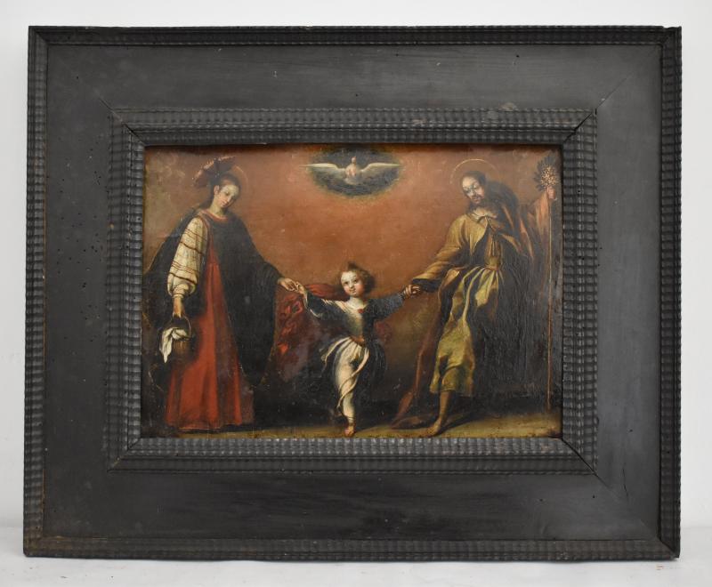 Representación de la Sagrada Familia con los tres integrantes en pie y actitud de caminar. Todos son figuras elegantes y esbeltas, pero el Niño y San José muestran un mayor dinamismo que la Virgen gracias a su actitudes y al movimiento quebrado y amplio de sus paños. Sobre el fondo, neutro de color marrón, emerge la Paloma del Espíritu Santo. Llama la atención la brillante gama cromática del conjunto, además de su valiente y graciosa composición. Se completa con un marco de color negro y ornamentación a base de golpes de talla que también hemos visto en otros cuadros coetáneos de cuantos se conservan en la Basílica