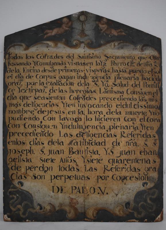 Tabla de indulgencias por las que en 18 lineas se concede indulgencia plenaria a los cofrades del Santísimo Sacramento que confesaren y comulgaren la Encina "desde primeras vísperas [en torno a las 19 h.] hasta puesto el sol" el día del Corpus y en otras fechas señaladas.