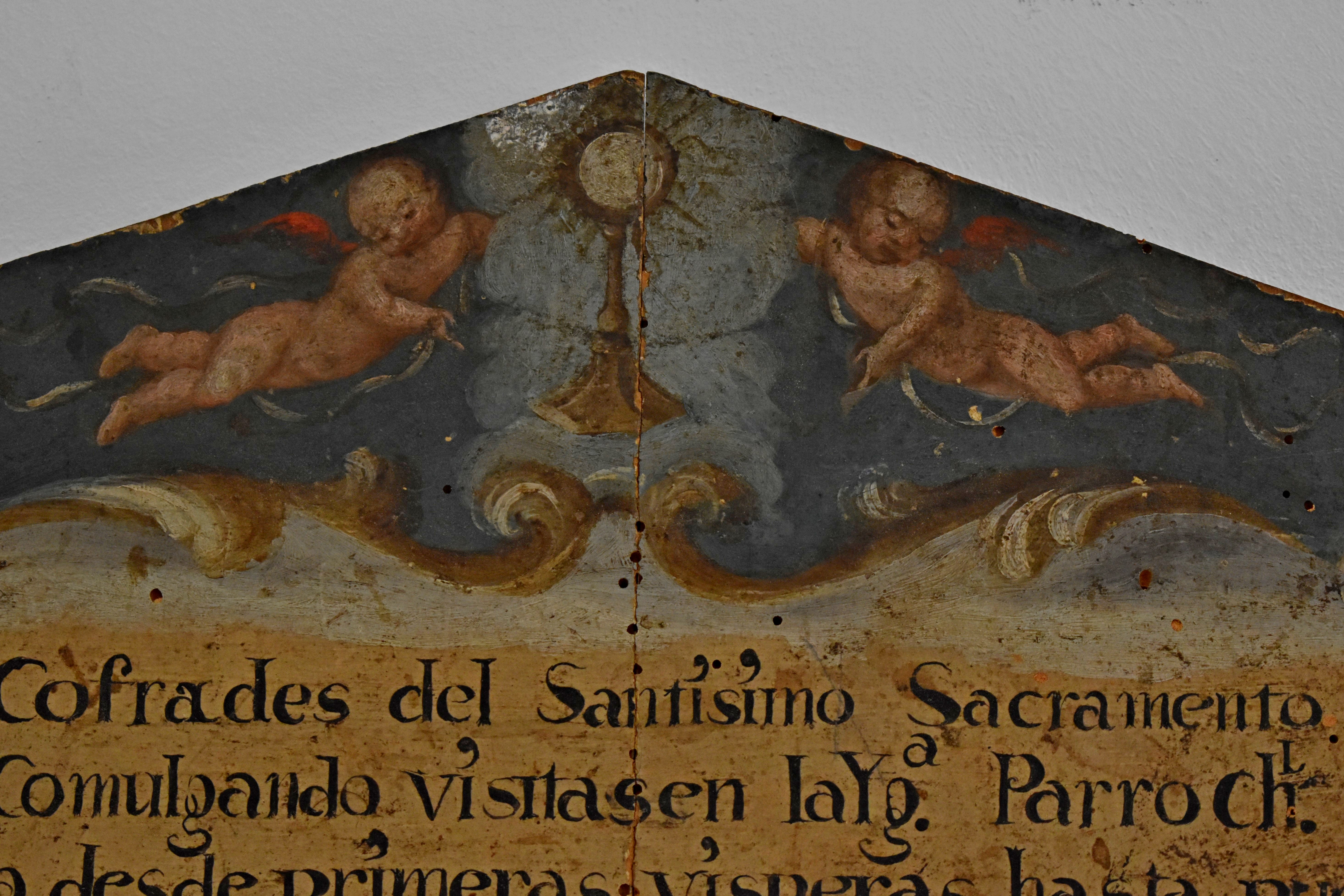 La tabla, rectangular con remate piramidal, inscribe en texto en un cuero recortado pintado que la cubre casi por entero sobre un fondo celestial, en cuyo ápice dos angelotes alados flanquean una custodia.