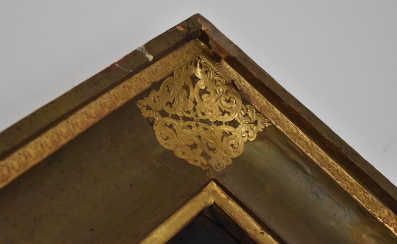 Conserva el marco original, sencillo, dorado y ornado con sencillos motivos pintados y dorados, a modo de calados, en sus esquinas.