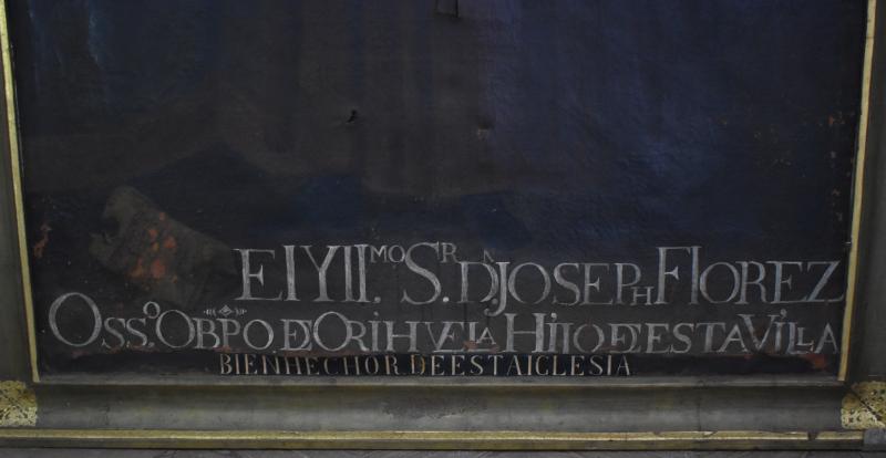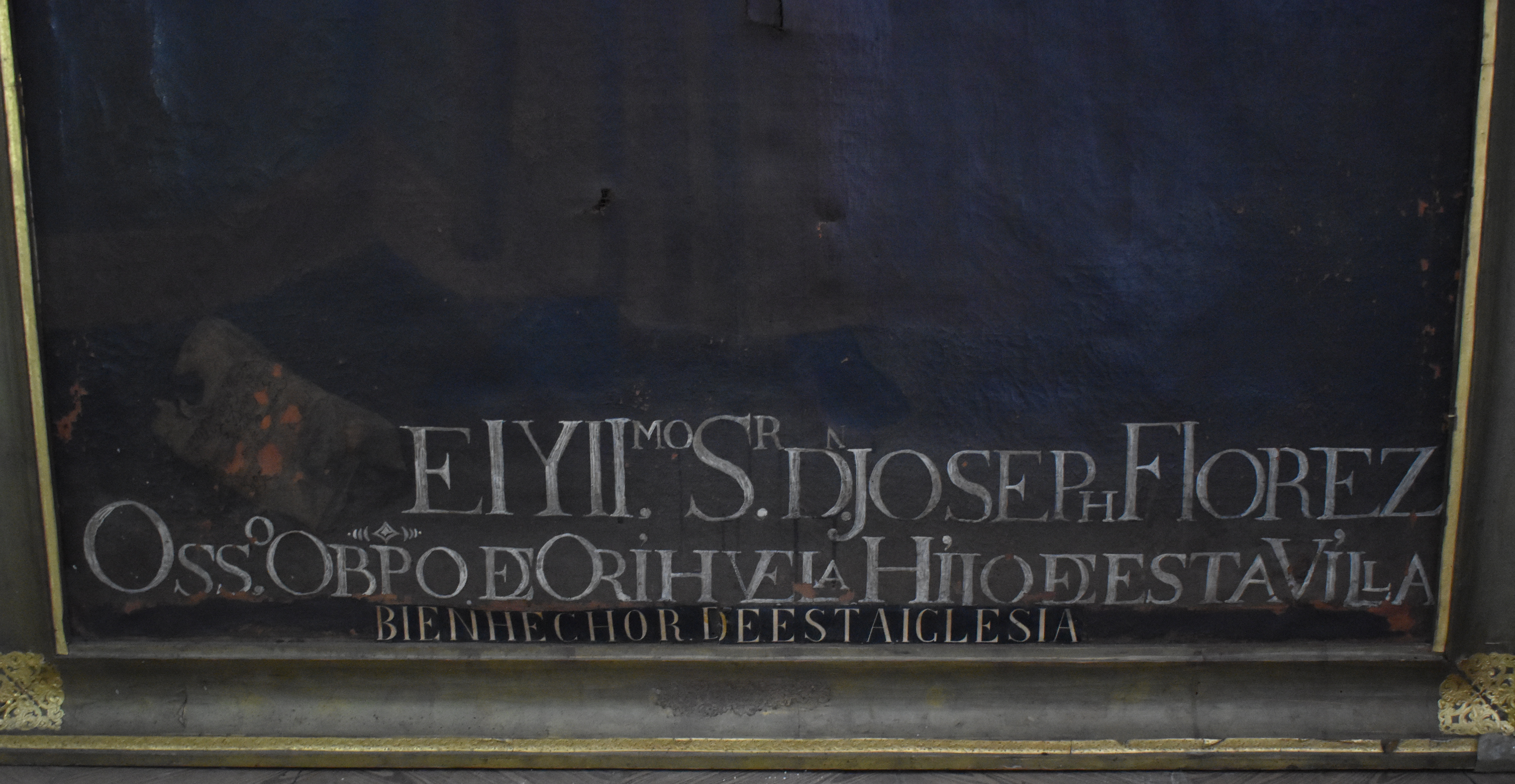 Inscripción pintada (contemporánea al lienzo): El Yll[ustrísi]mo S[eño]r D[on] Joseph Flórez Oss[ori]o, Ob[is]po de Orihuela, hijo de esta villa.