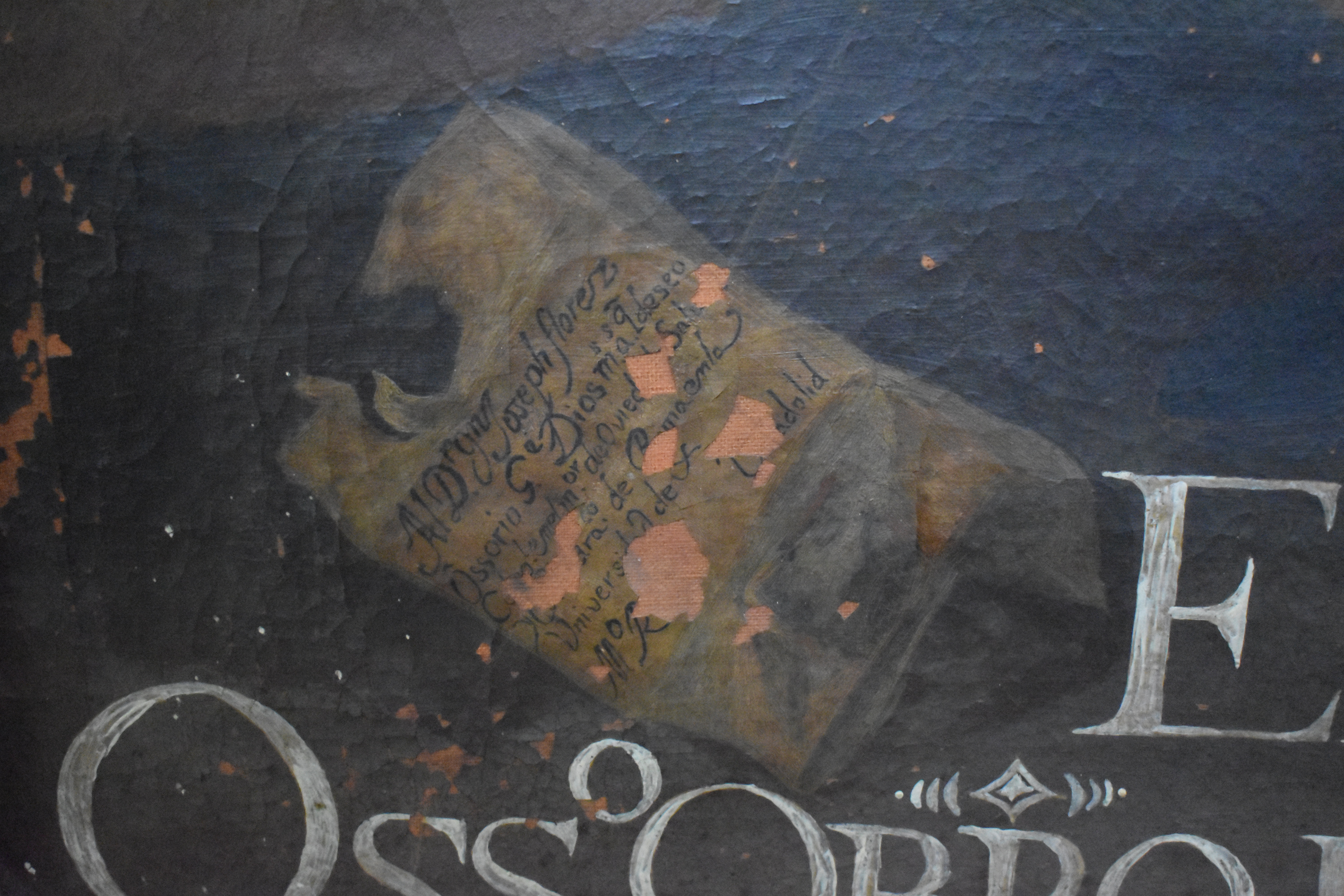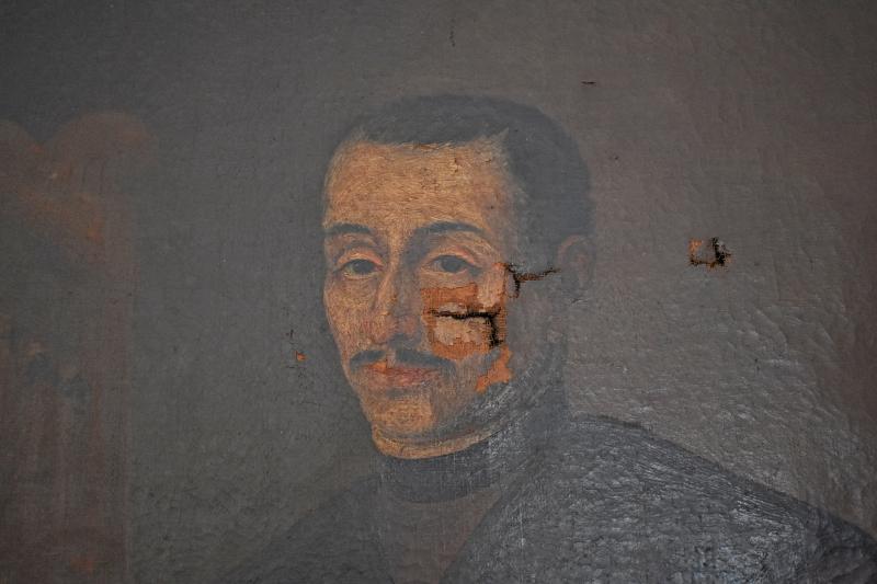 Una inscripción en dos líneas, contemporánea al lienzo, identifica al donante retratado. Muy posteriormente se añadió una tira de papel calificándole de "bienhechor del templo".