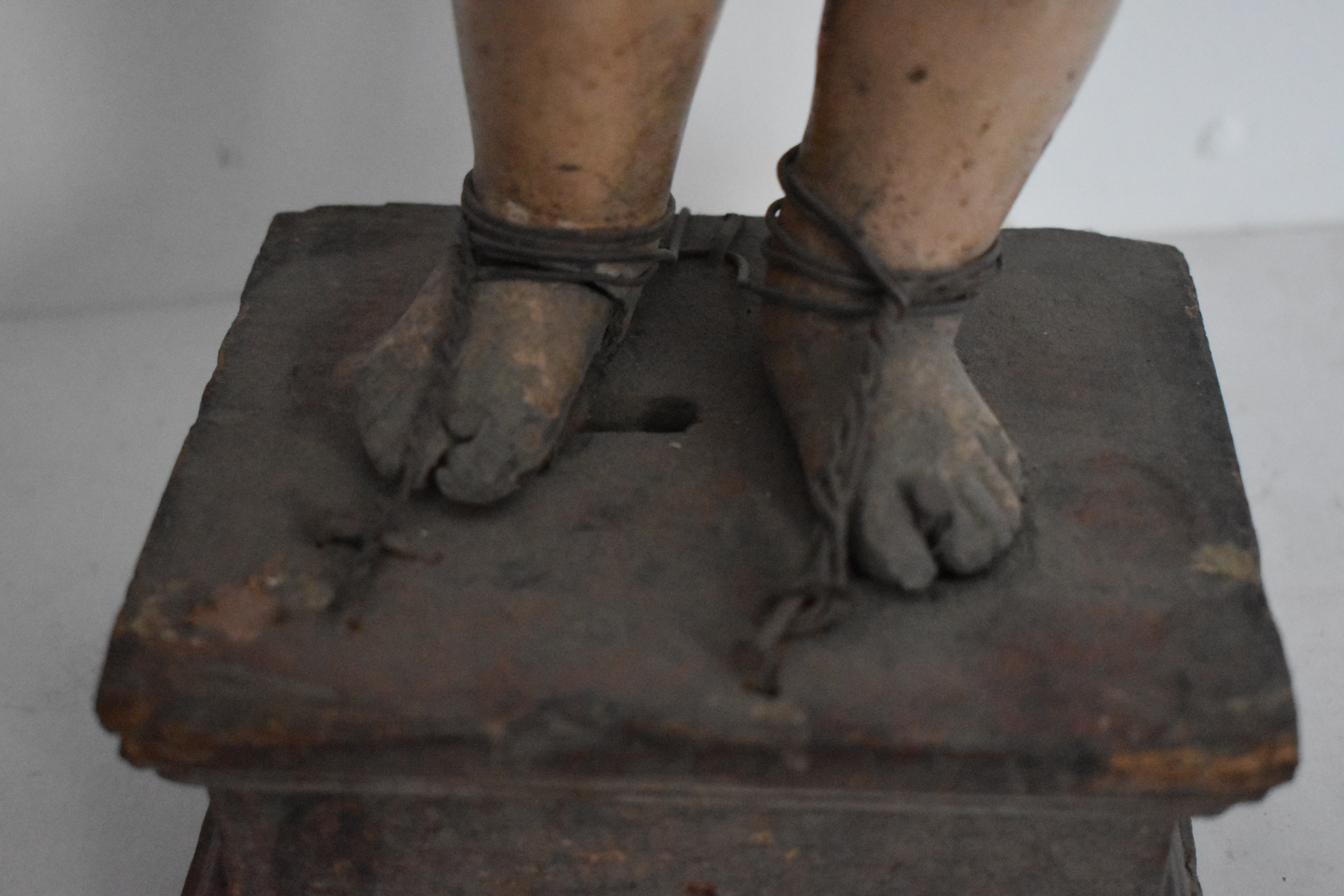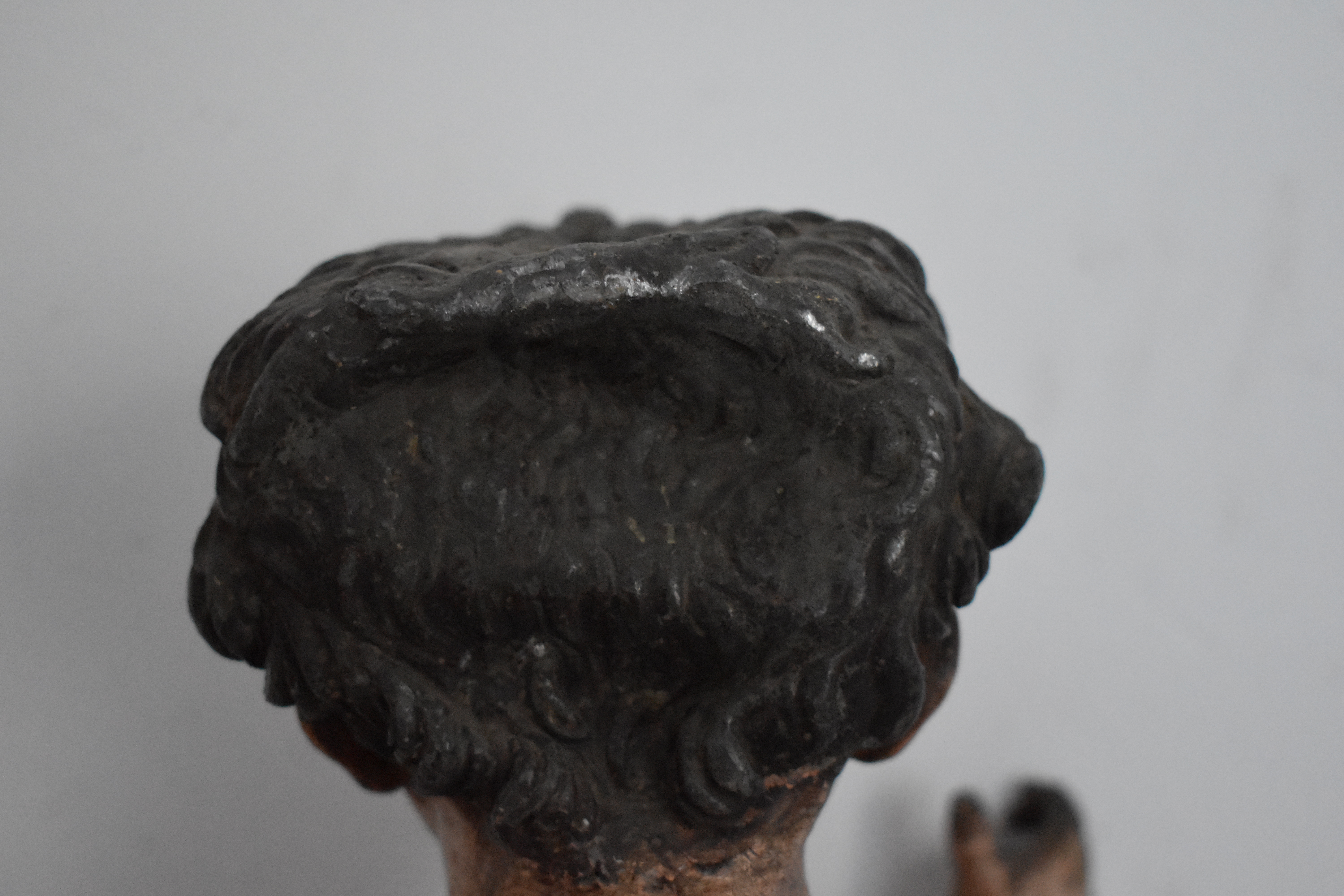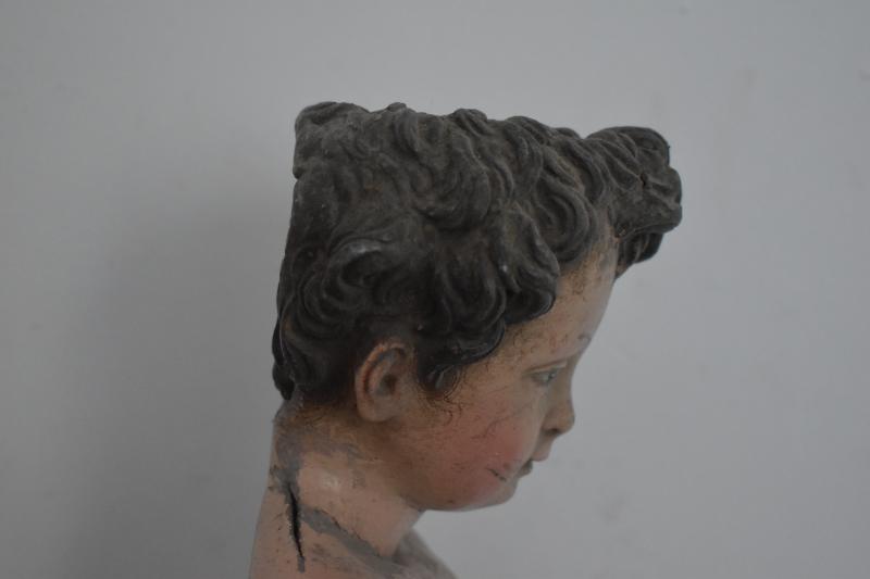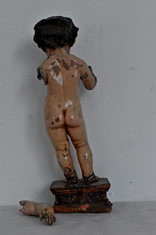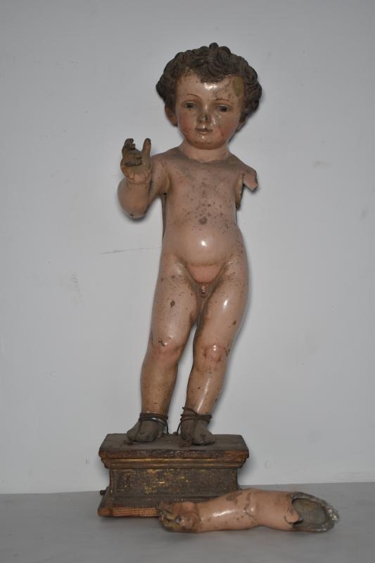Imagen de bulto del Niño Jesús realizada a modo, como tantas otras figuras de plomo o de peltre de esta iconografía. Recuerda a los modelos montañesinos. Se dispone en un acusado y elegante contrapposto, con el brazo derecho a media altura. El brazo izquierdo se pegaba al cuerpo, aunque hoy se encuentra desprendido. No es este el único deterioro de la imagen, pues presenta múltiples abolladuras y pérdidas en su policromía. A pesar de todo, no cabe duda de que es una imagen de interés y valiosa tanto por su factura como por su escasez por estas tierras
