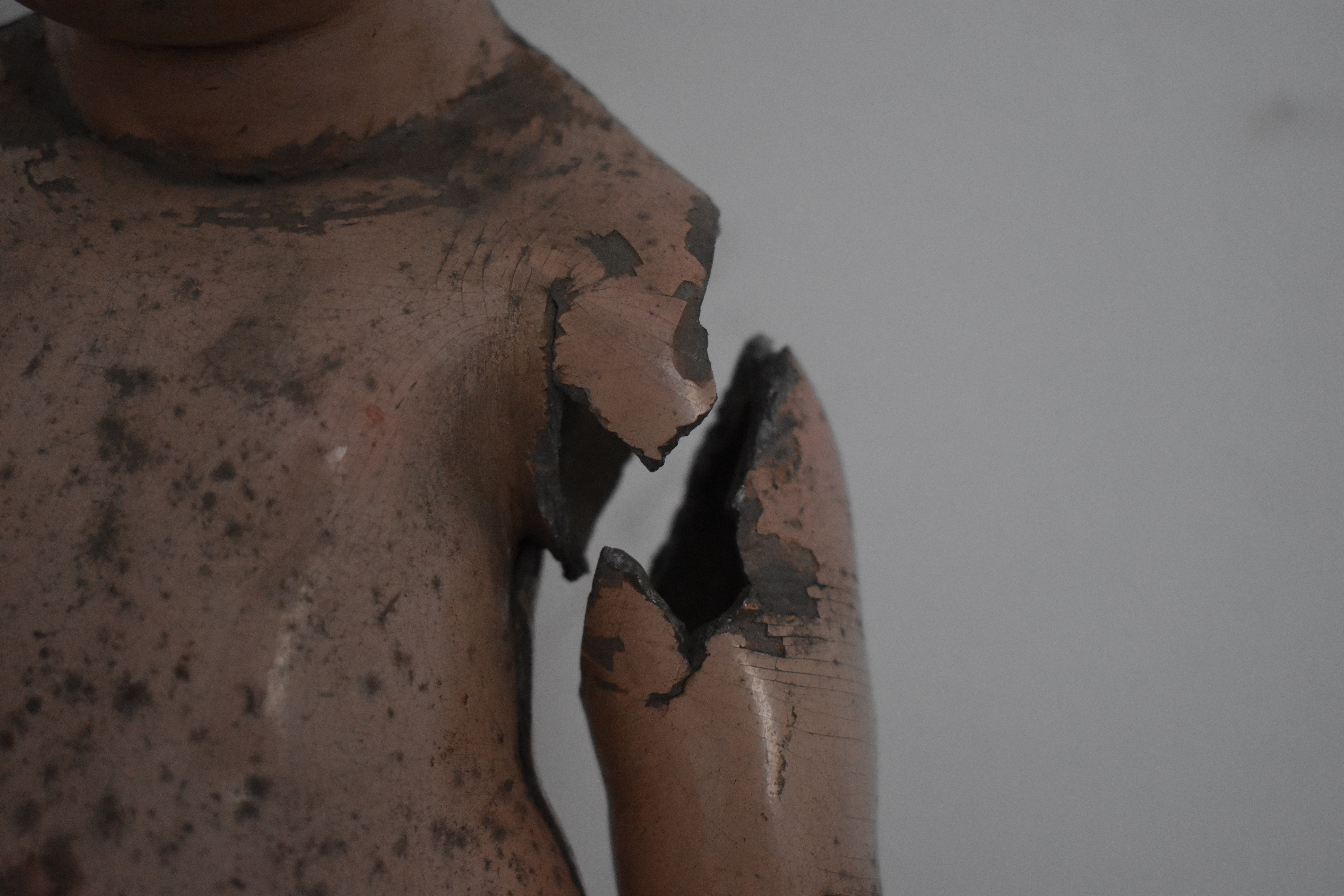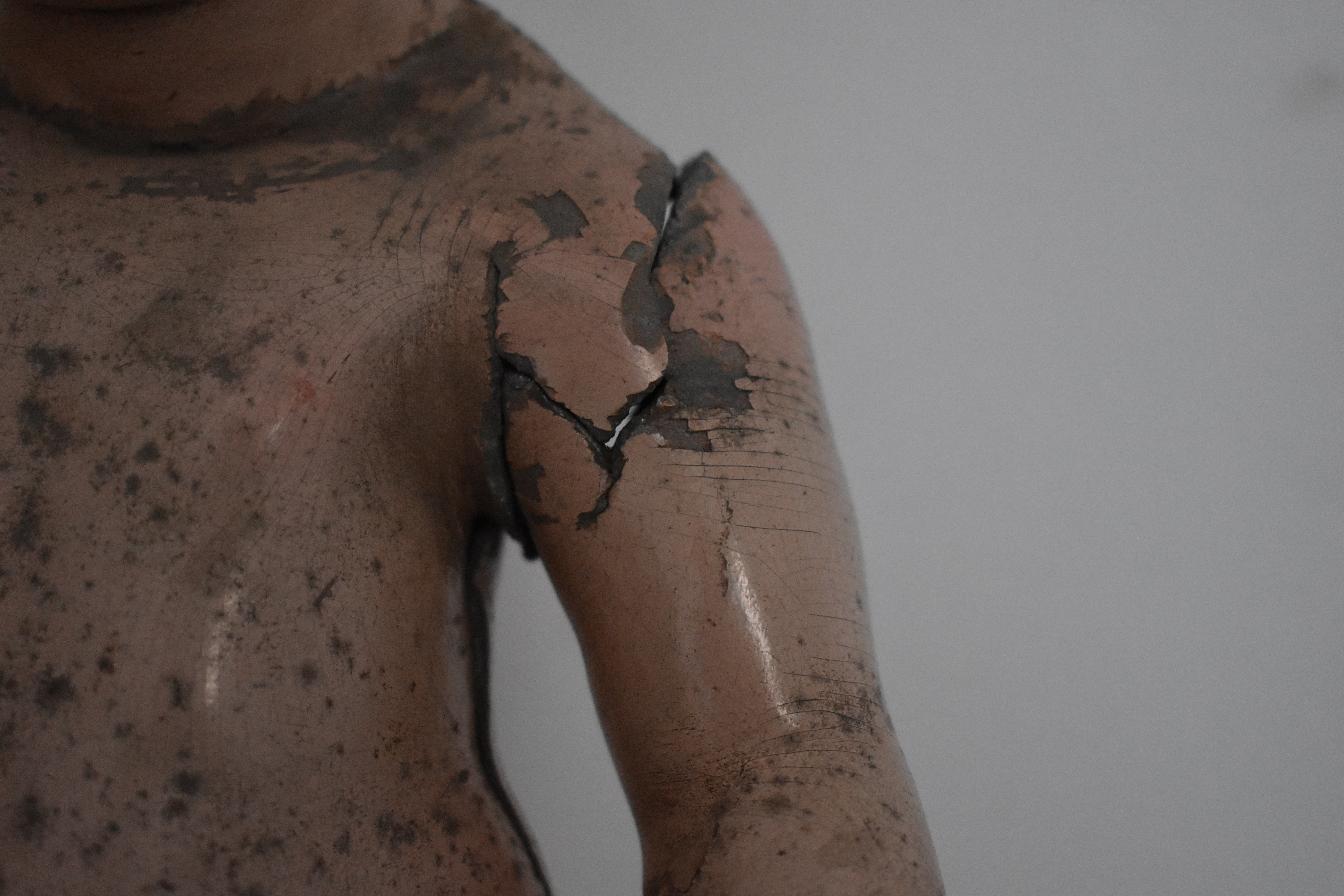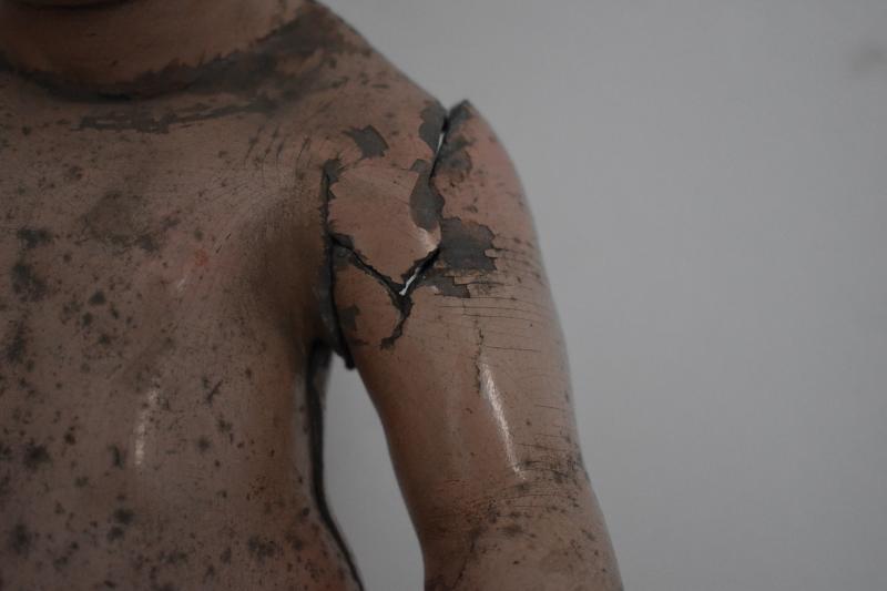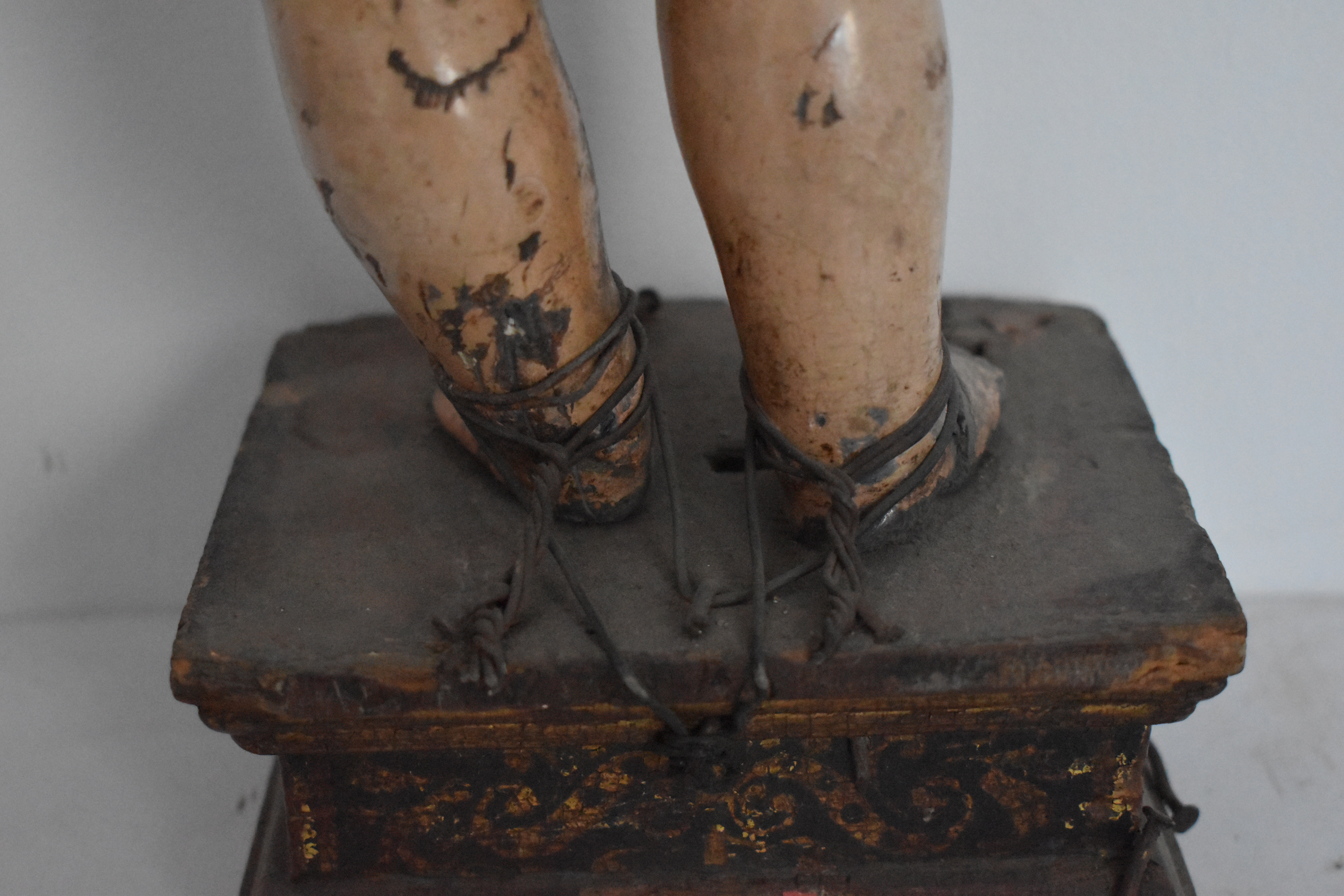 Imagen de bulto del Niño Jesús realizada a modo, como tantas otras figuras de plomo o de peltre de esta iconografía. Recuerda a los modelos montañesinos. Se dispone en un acusado y elegante contrapposto, con el brazo derecho a media altura. El brazo izquierdo se pegaba al cuerpo, aunque hoy se encuentra desprendido. No es este el único deterioro de la imagen, pues presenta múltiples abolladuras y pérdidas en su policromía. A pesar de todo, no cabe duda de que es una imagen de interés y valiosa tanto por su factura como por su escasez por estas tierras