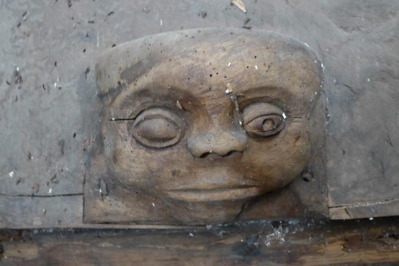 Pieza de madera de sección cuadrada, fijada a la parte inferior de su correspondiente estalo. Su decoración es figurativa, y representa una ancha cara con ojos saltones (el derecho, según se mira, con la pupila excavada), y nariz corta, muy ancha y achatada. Su ancha frente remata en la parte plana, reposo de la misericordia.