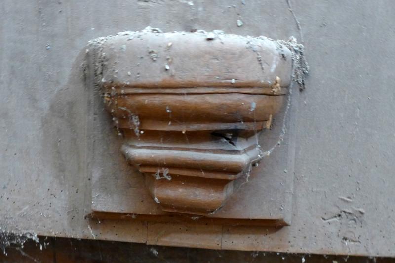 Pieza de madera de sección cuadrada, fijada a la parte inferior de su correspondiente estalo. La parte superior de la misericordia, la más ancha, es de planta semicircular, y servía para apoyarse. Su decoración, de carácter arquitectónico, semeja una ménsula moldurada, de perfil prismático irregular invertido.