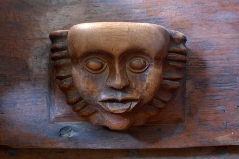 Pieza de madera de sección cuadrada, fijada a la parte inferior de su correspondiente estalo. Su decoración es figurativa, y representa una ancha cara con ojos saltones, boca entreabierta por la que asoma la lengua y mentón muy alargado. Su ancha frente remata en la parte plana, reposo de la misericordia. Todo el rostro está enmarcado por unos pliegues, para resaltarla.