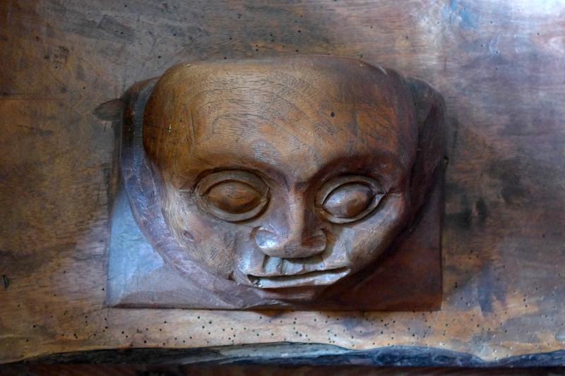 Pieza de madera de sección cuadrada, fijada a la parte inferior de su correspondiente estalo. Su decoración es figurativa, y representa una ancha cara con ojos muy saltones, ancha y aplastada nariz, y boca torcida. Su ancha frente remata en la parte plana, reposo de la misericordia.