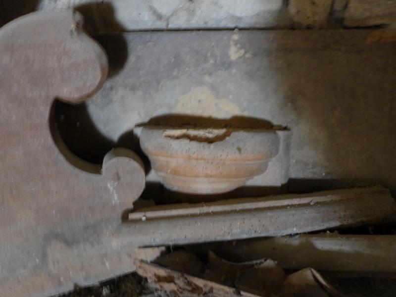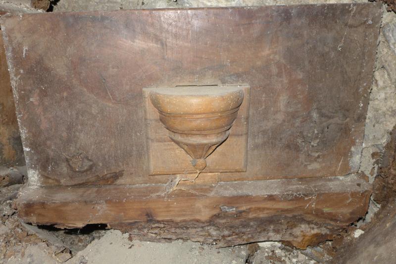 Piezas de madera de sección cuadrada, fijada a la parte inferior de su correspondiente estalo, ya arruinado, o directamente conservada separada de él. Una tiene decoración geométrica y otra vegetal.