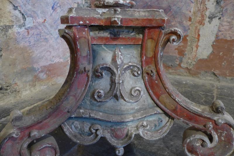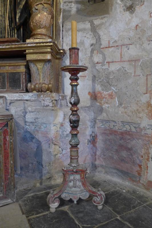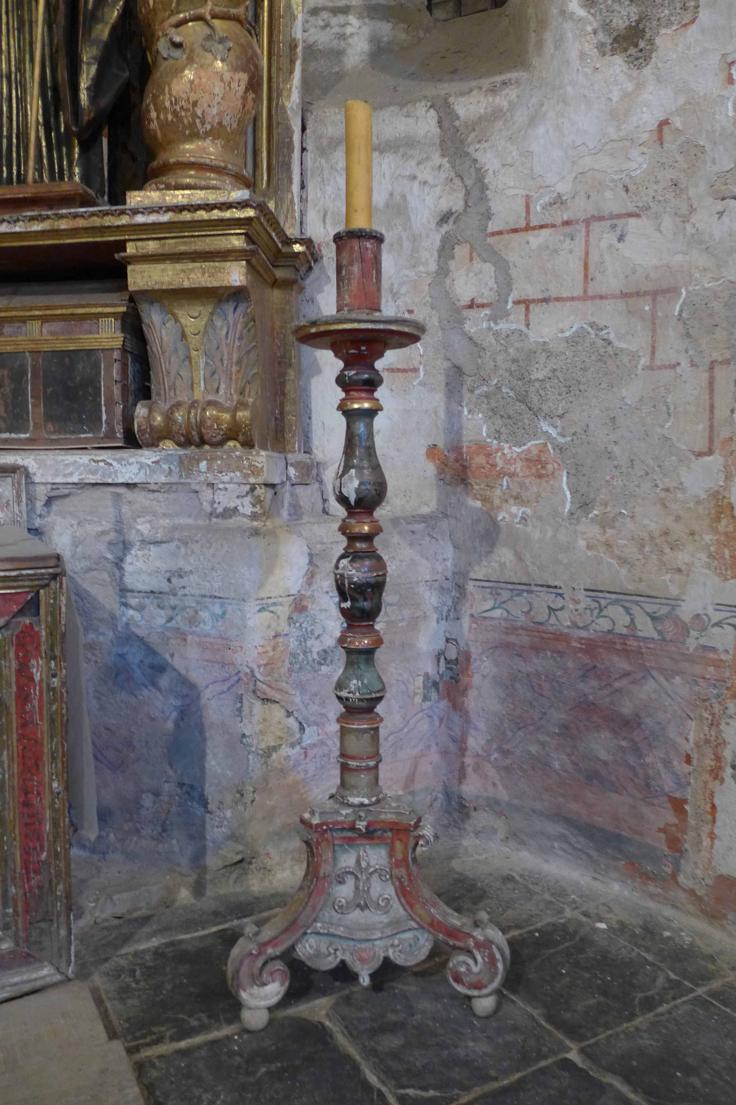 Forma parte de un conjunto compuesto por otros tres, de idénticas características, tan solo diferenciados por los símbolos heráldicos que figuran en su basa. Consta de una desarrollada basa en forma de pirámide truncada compuesta de tres pies avolutados apoyados en bolas, unidos por paneles donde figuran tales símbolos en relieve, vástago torneado y soporte para colocar el hacha de cera en su parte superior, todo policromado en tonos rojizos y azulados.