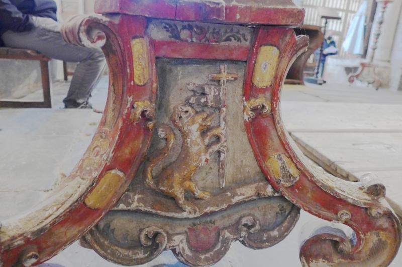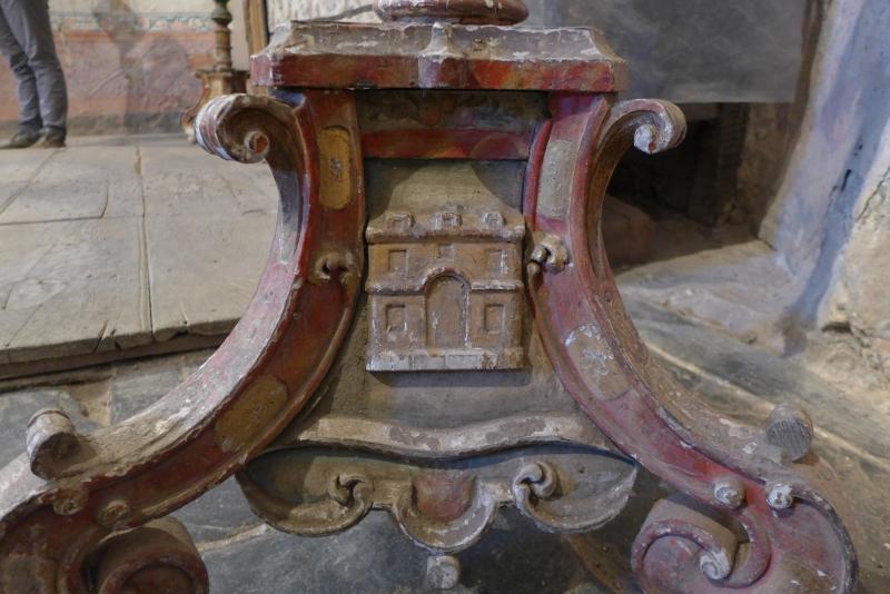 Los símbolos heráldicos, en color amarillo semejando dorado, son: flor de lis, monasterio, y un león rampante apoyado en una cruz con gallardete de dos farpas (emblema del monasterio).