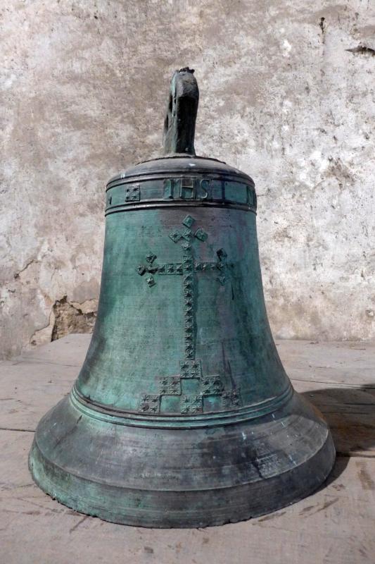 Campana de perfil esquilonado. En el tercio, entre dobles cordones arriba y abajo, muestra la inscripción IHS y AÑO 1711, con letras romanas mayúsculas, y decoración de moldes cuadrados. En el medio exhibe una cruz de calvario de moldes cuadrados con estrellas de ocho puntas, y brazos rematados en cruz con moldes girados. El Gólgota se construye con moldes de cuatro estrellas de ocho puntas en tres alturas. Su medio pie se adorna con tres cordones.