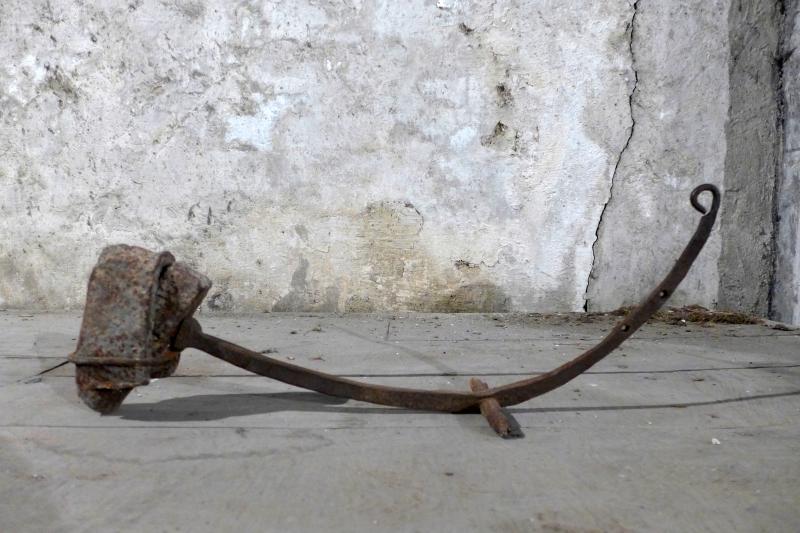 Pletina curva de hierro rematada por un gancho en un extremo, y en el otro por cordón férreo para atar dos piezas también de hierro, una doblada en ángulo para golpear con un trozo de hierro en el interior para otorgarle peso.