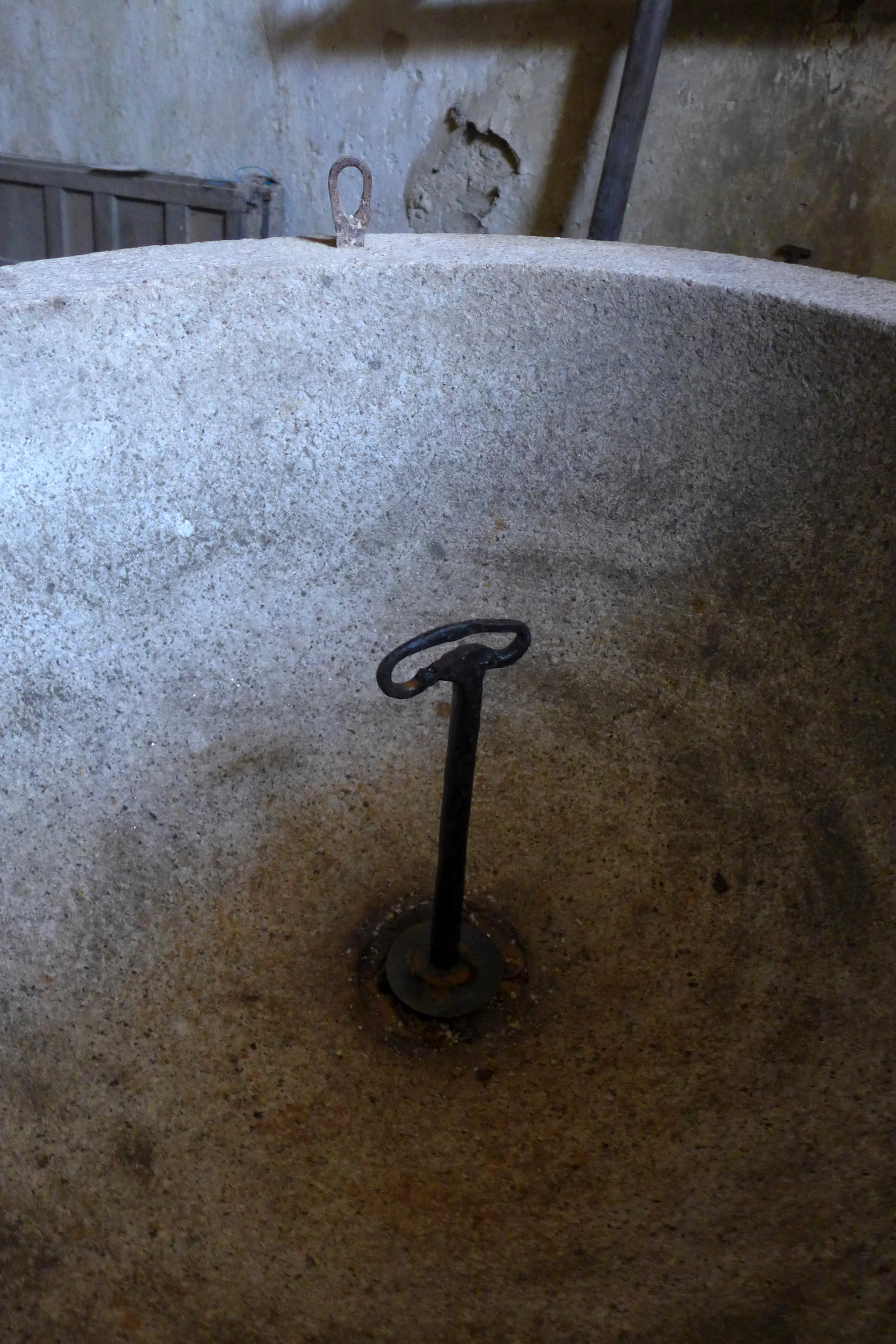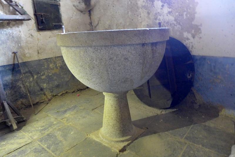 Se compone de basa (zócalo y toro, el primero embutido en el pavimento), pie (un fuste troncocónico) y vaso liso, en forma de media esfera con resalte para la embocadura. Conserva los herrajes para anclar la tapadera, así como para la tapa del desagüe (tapón, largo vástago y argolla achatada), y la propia tapadera de madera.