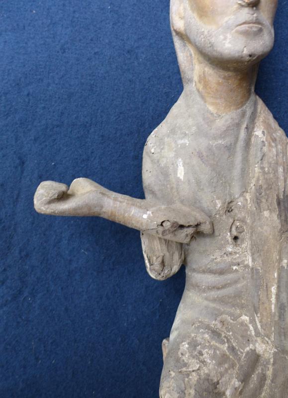 Posiblemente el brazo izquierda, unido por un clavo de forja porque se deterioró y se separó del cuerpo) estuviese levantado. Esa mano apenas diferencia, en el estado de conservación donde se encuentra, sus dedos, al contrario de lo que ocurre con la contraria.