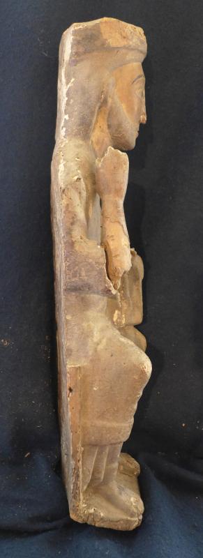A pesar de lo esquemática de la talla, genera pliegues en la indumentaria bien resueltos, un tanto simétricos en su parte superior.