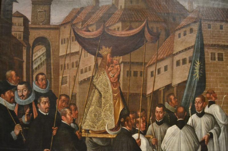 Este lienzo, del que tantos datos se conocen, ha recibido a lo largo de la historia diversos nombres además del que en esta ficha le identifica, todos ellos hablando del hecho milagroso que en él se narra como "Rogativa por la extinción de un incendio", "La Virgen de la Encina milagrosa intercesora en un incendio en Ponferrrada"... Sea como sea, lo que muestra este intersante lienzo es la labor intercesora de la Virgen en otro hecho milagroso más en la vida de la villa ponferradina. Aquí se representa la rogativa que esta villa hizo a la Virgen para que extinguiera un incendio que tuvo lugar en 1622 en unas casas de Beatriz de Cancelada. Por ello, el tema principal es el de una procesión en la que la imagen es portada en andas y bajo palio la talla de Nuestra Señora de la Encina. Sus andas son portadas por clérigos y sostienen las varas del palio cuatro eclesiásticos. Preceden la comitiva otros cuatro clérigos. Un caballero regidor lleva el pendón de la ciudad y el corregidor va acompañado de otros tres regidores, todos esos personajes civiles visten ropilla negra y gola, acorde a la moda de la época. A la derecha una mujer tullida de rodillas apoyada en las muletas con un perro. Como fondo el caserío de Ponferrada con la puerta o arco del Reloj. Al lado derecho del cuadro se evidencia un pavoroso incendio.