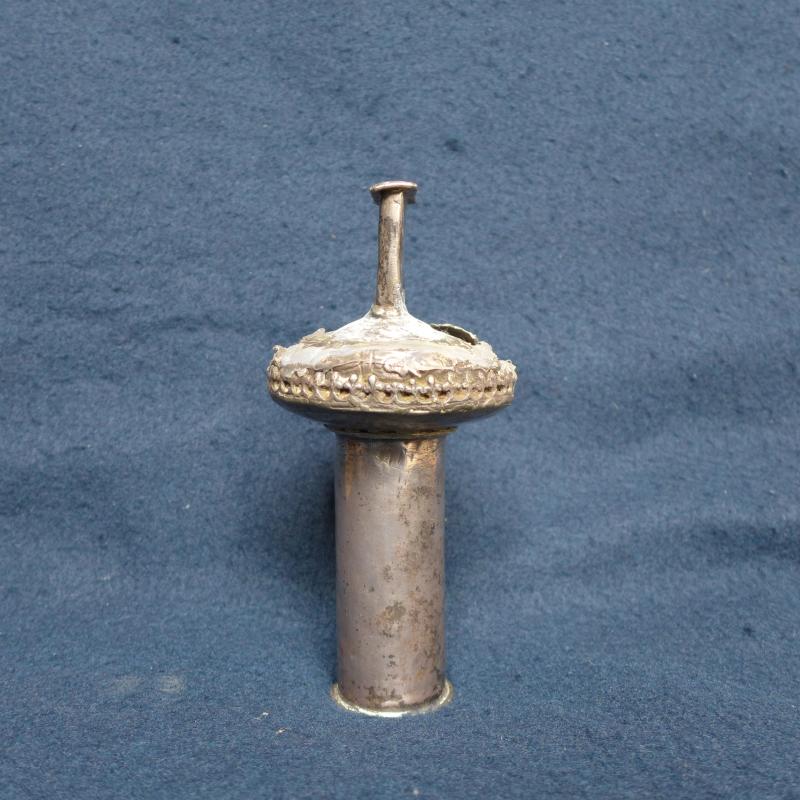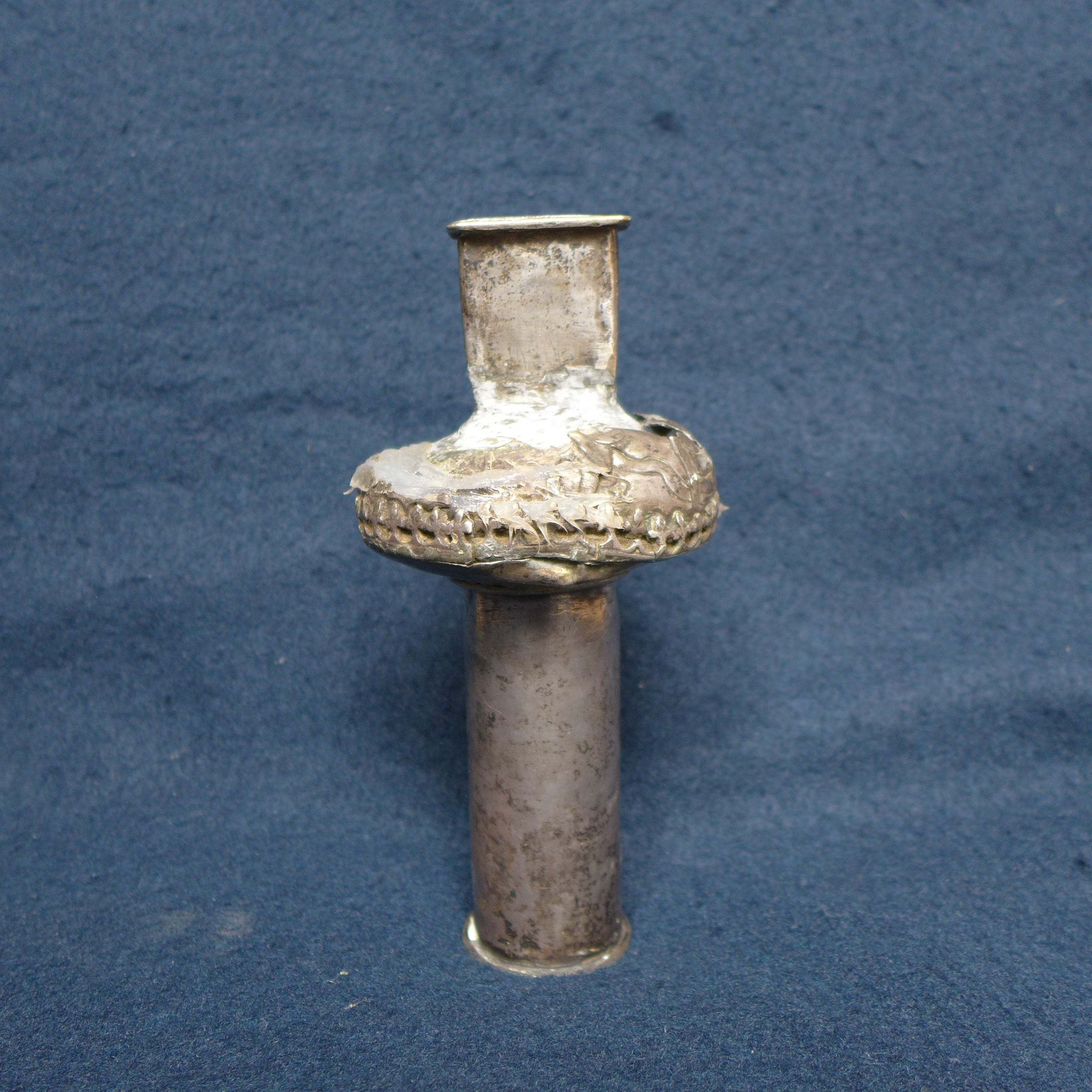 Conserva macolla, aunque muy maltratada. Se compone de cañón cilíndrico liso, nudo achatado con cenefa de hojas treboladas y parte superior plana para enmangar la cruz