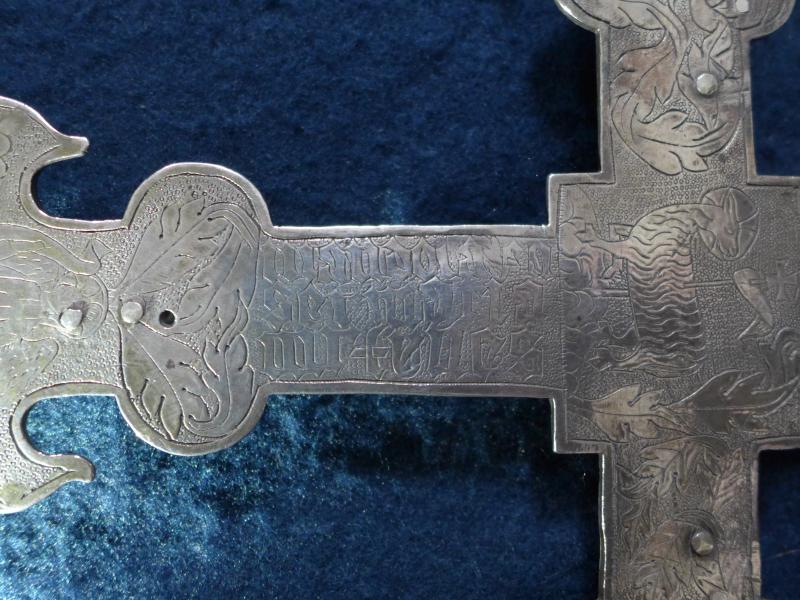 El reverso luce una superficie más ornamentada, con los símbolos del Tetramorfos en los remates, un Agnus Dei con lábaro y cruz en el cuadrón central, y una inscripción con letras gótica en el brazo inferior. Esta reza: "Mandola fa/ser maria / m[a]rtynes".