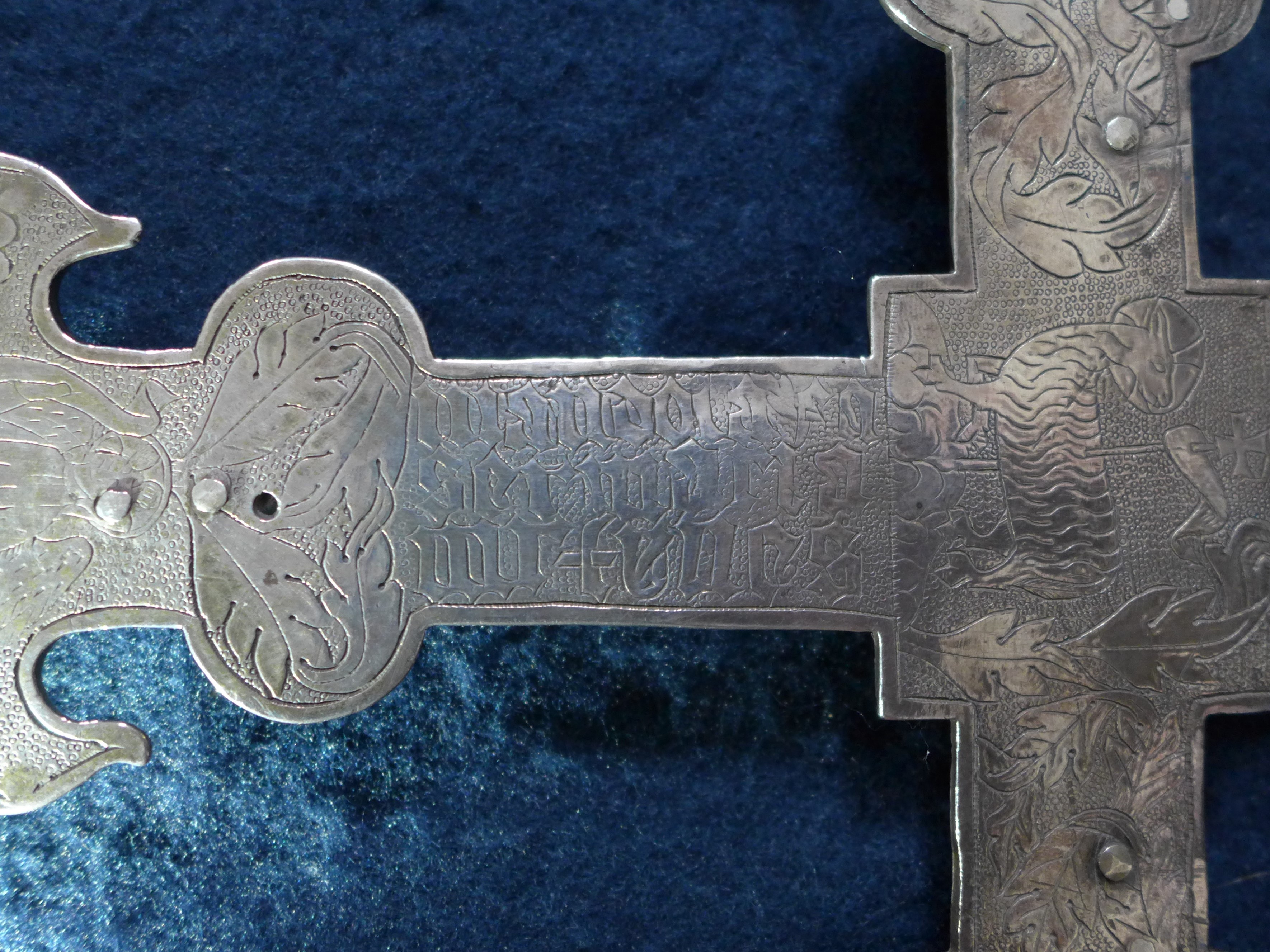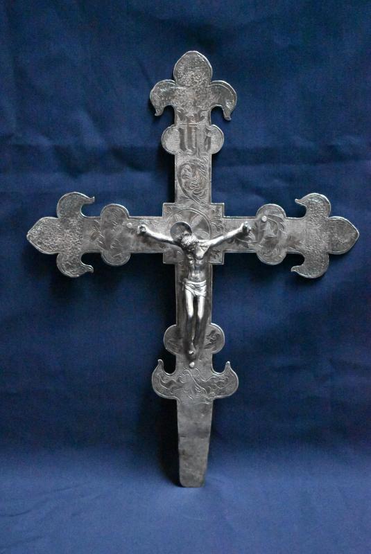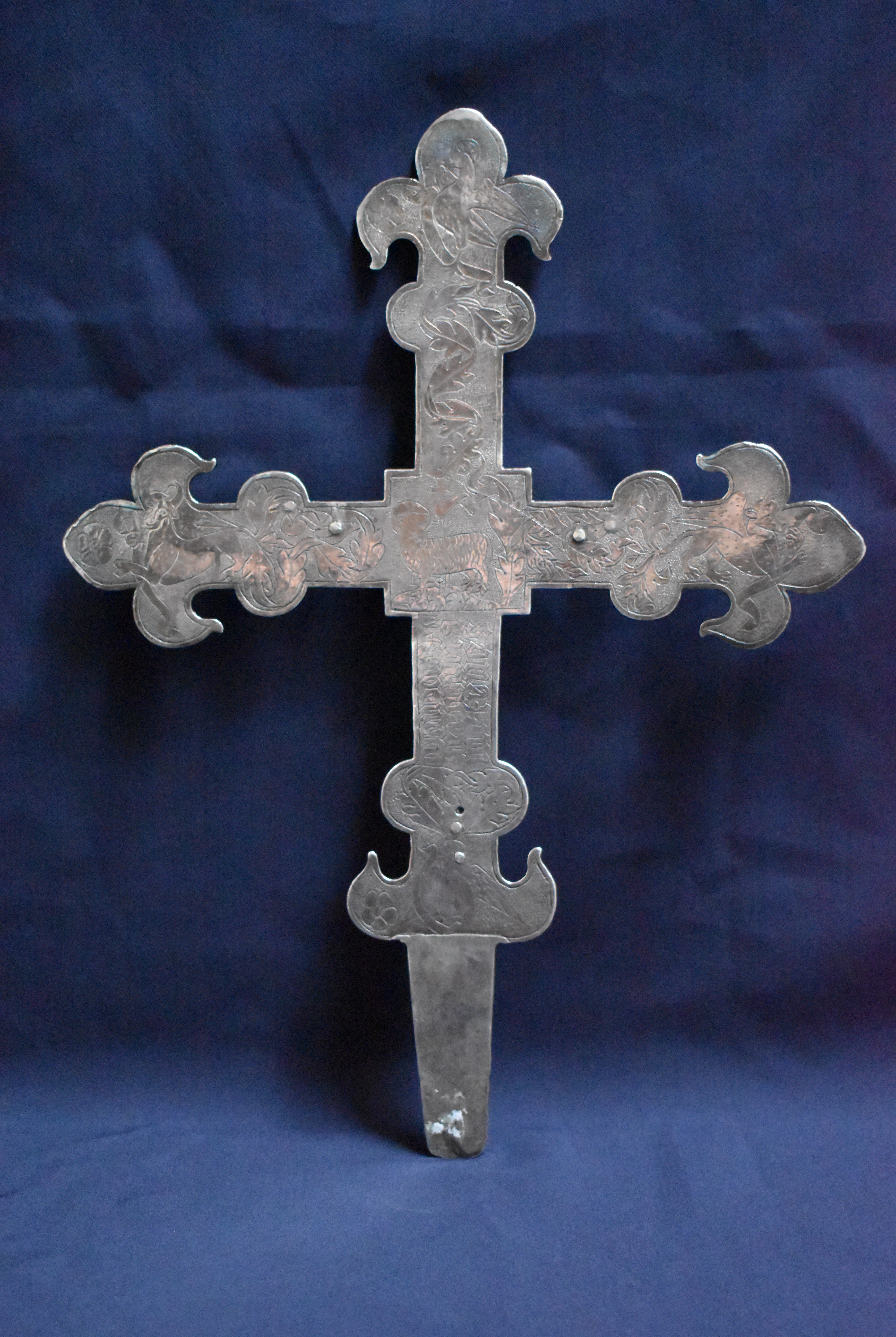 Ejemplar de cruz de plancha de plata, de similar tipología a las ya conocidas de Peñalba, Villanueva de Valdueza y Santo Tomás de las Ollas. Elaborada en una fina plancha de metal martilleada, grabada y trabajada a dos haces de manera más o menos elaborada. Es de perfil de cruz griega latina aunque de stipes bastante corto, brazos con expansiones ovales y terminaciones flordelisadas y cuadrón central cuadrangular. Toda su superficie va cuajada de rameados vegetales y fondo punteado. Sobre el cuadrón del anverso se aplicó un crucificado de cronología posterior, del siglo XVI. Entre la expansión y remate superior se trazó el anagrama IHS en letra gótica de cinta.