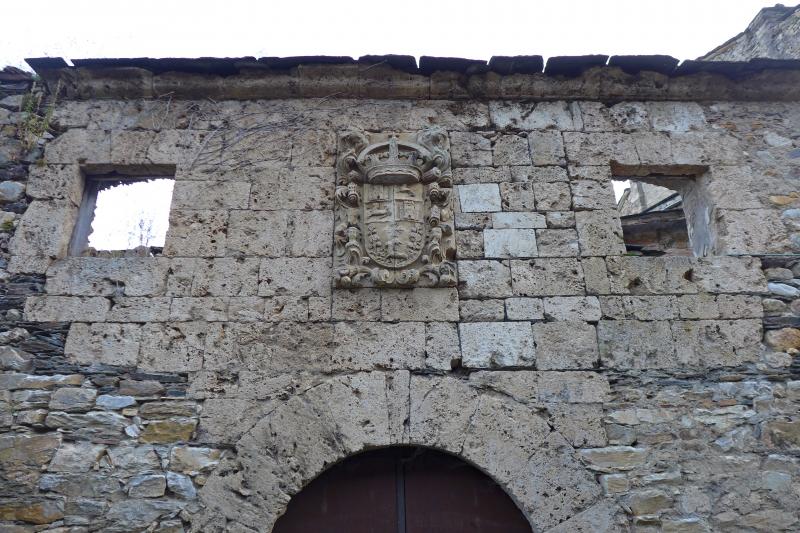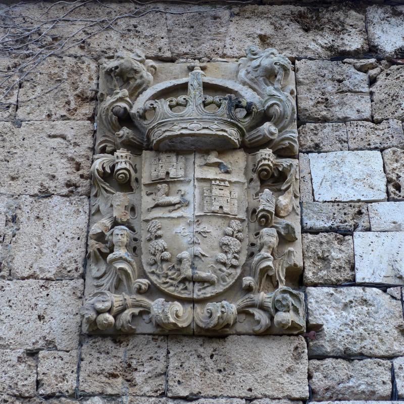 Escudo del monasterio, el más ornamentado de todos cuantos hay en los distintos soportes que se conservan. Se trata de un escudo cortado, con tablero de tipo español. En la región superior, el jefe en la terminología heráldica, los cuatro cuarteles con el escudo de Castilla y León (castillos y leones rampantes, por más que aquí más parezcan pasantes). En la región inferior, la punta, un león pasante con una asta por detrás rematada con una cruz flordelisada con gallardete de dos farpas. Dos desarrollados árboles flanquean a la fiera en los cantones. Se timbra de rey, con corona entre lambrequines rematada por una cruz de brazos abalaustrados, y se rodea de cueros recortados y cabecitas femeninas.