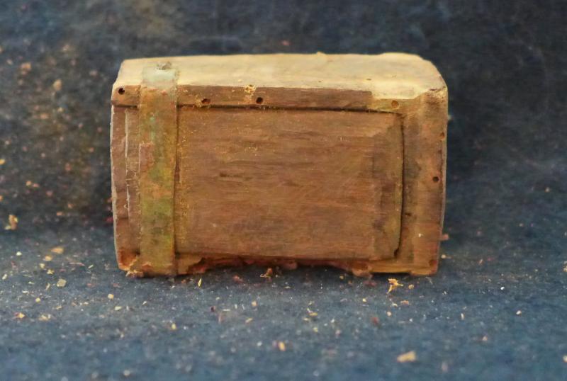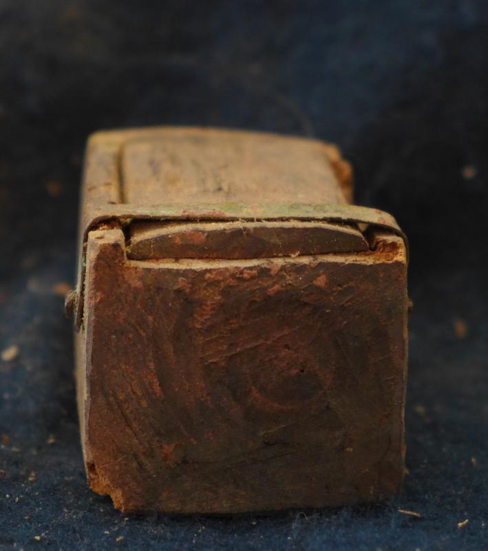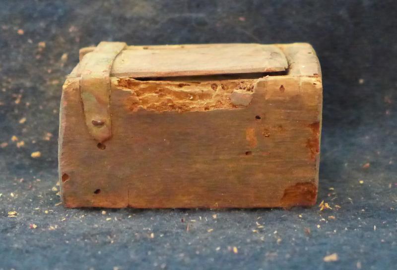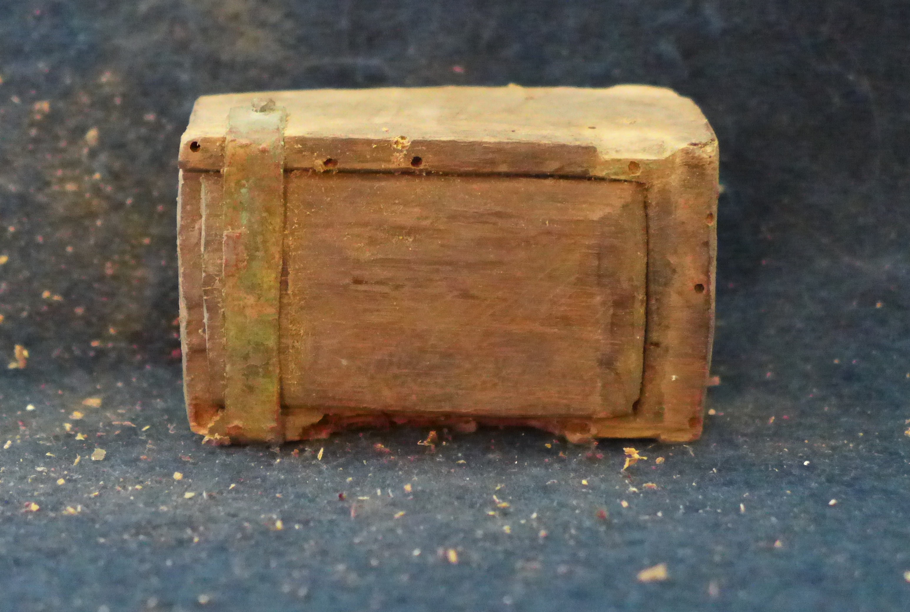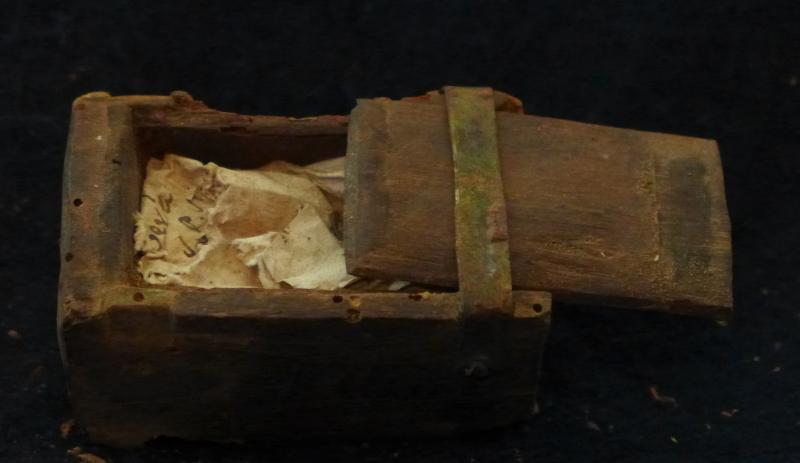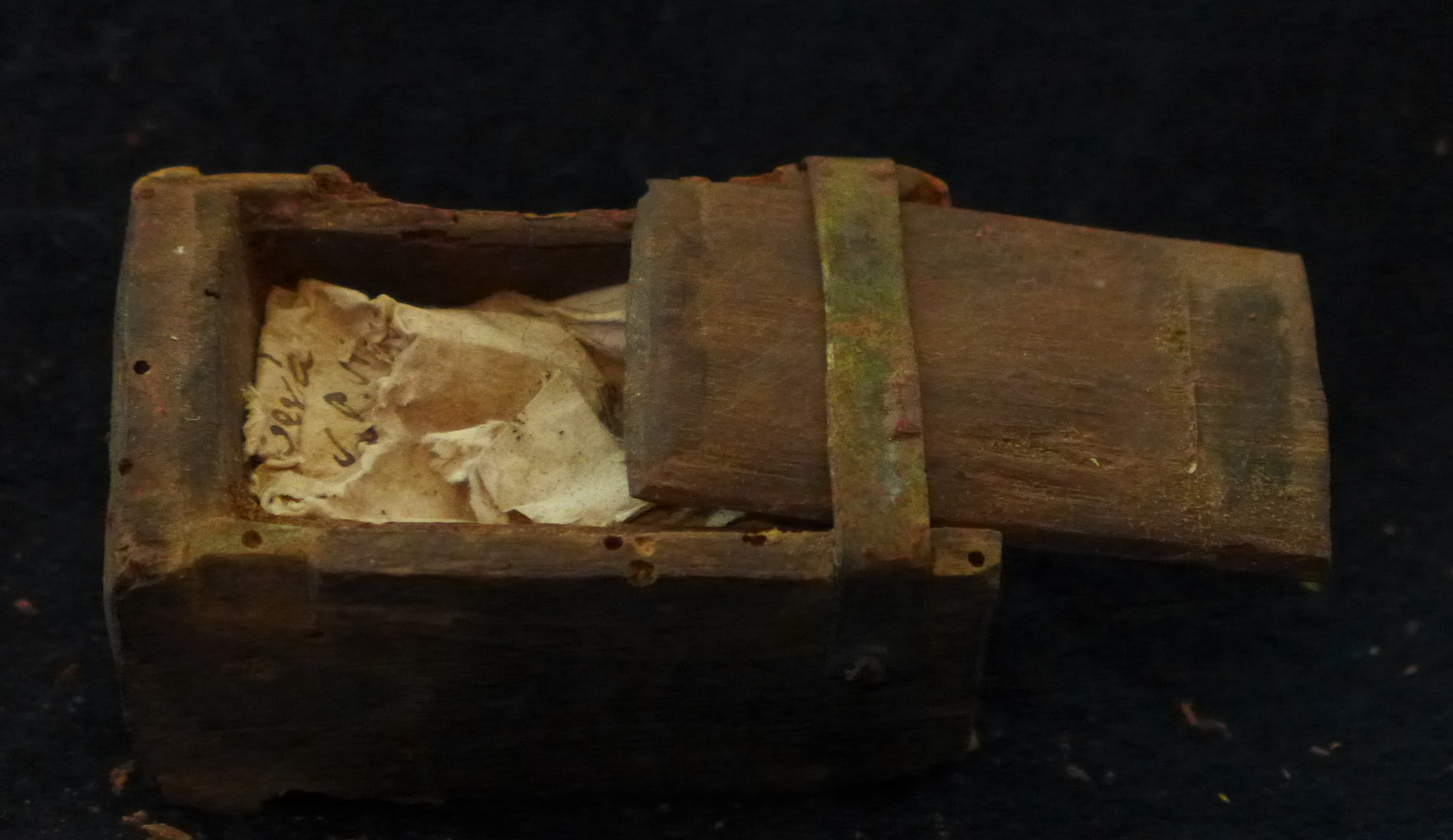 Caja prismática de una sola pieza con tapa deslizante en su parte superior reforzada por una lámina metálica. La tapa está sutilmente biselada. Apenas conserva en su interior varios papeles escritos, arrugados, con letra aparentemente de finales del siglo XVIII o principios del siguiente, copia de antiguas auténticas.