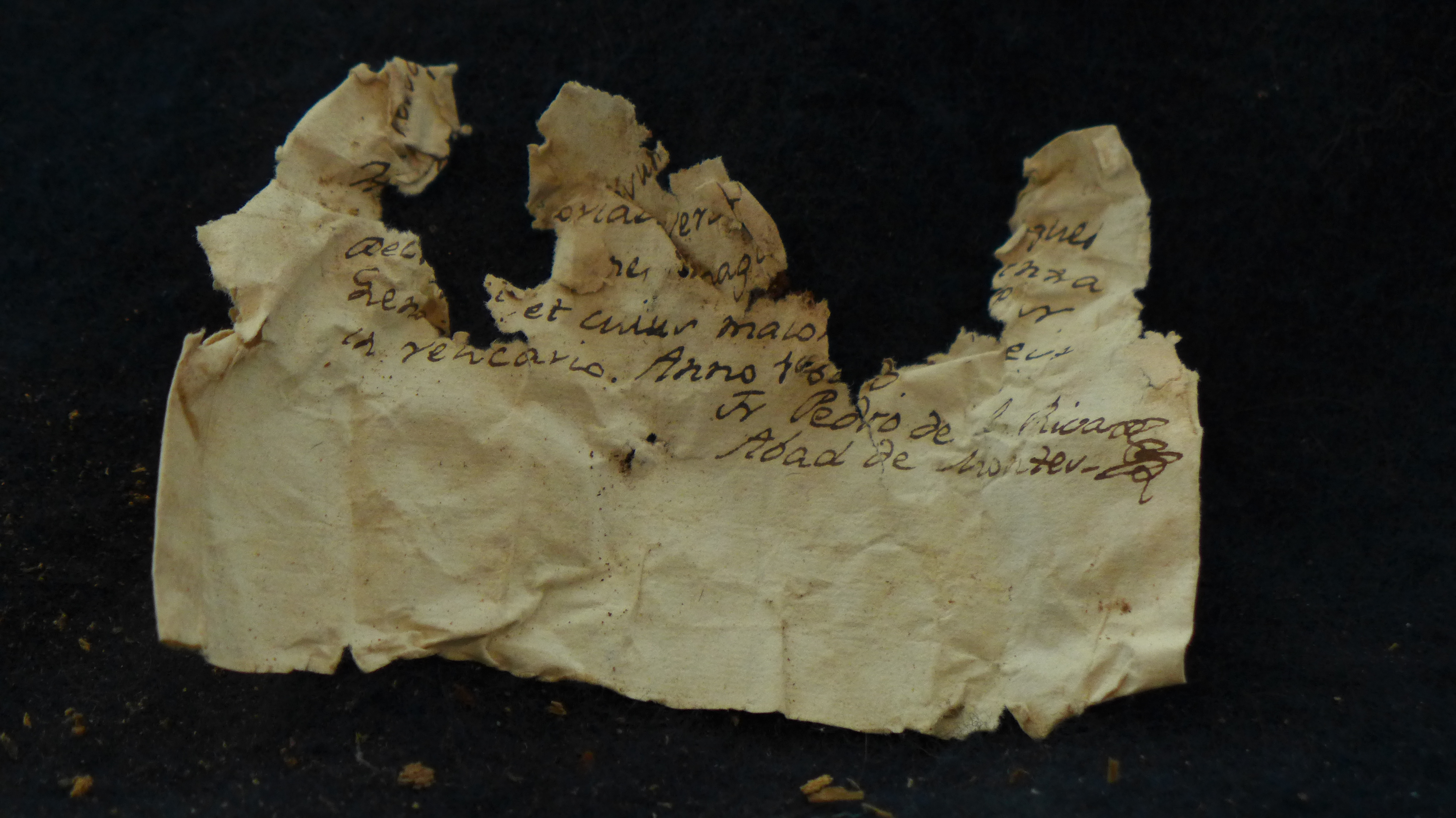 Inscripción del papel grande, en latín, aparentemente con una fecha del siglo XVIII, firmado por "fray Pedro de la Riva, abad de Montes" en 1803. No se puede leer por su carácter fragmentario, pero parece que trata de las reliquias de san Genadio.