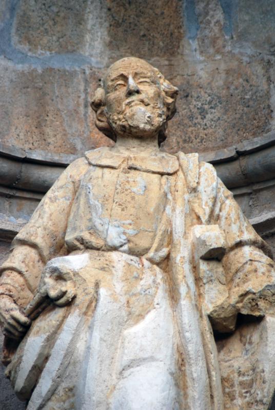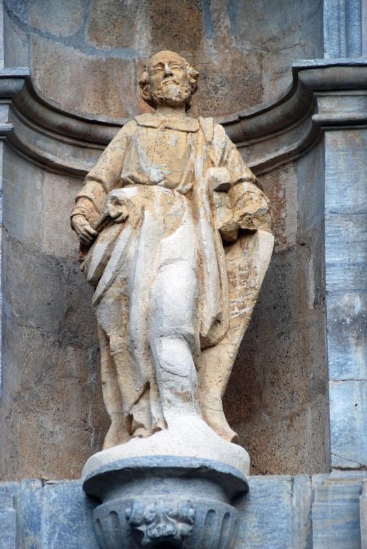 San Pedro, sobre peana circular, se muestra de pie, en suave contrapposto. Con la frente despejada y barbado, porta vestido y manto sostenido por un hombro, de plegados poco desarrollados. Como atributo, porta las llaves en su mano derecha y se ha perdido el de la mano izquierda, que pudiera ser el genérico libro.
