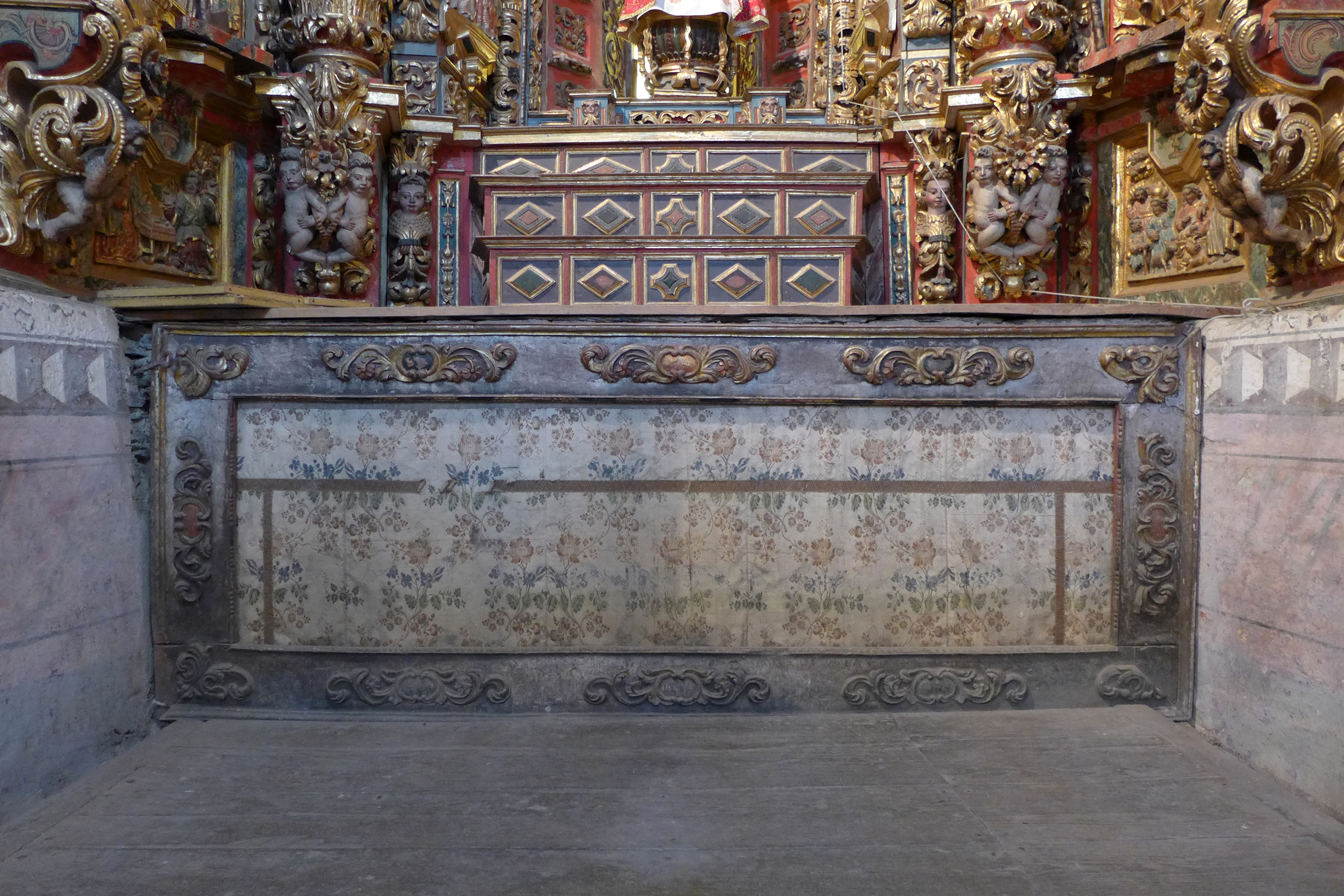 Frontal de lienzo, compuesto de varios retales cosidos de la misma tela. Tres galones dorados (uno horizontal y dos verticales) dividen el frontal en cuatro espacios, siendo el central inferior el que más espacio ocupa. El tejido se adorna con motivos florales azueles, grises y rosáceos. El frontal se conserva con su ancho marco de madera, dorado y policromado en su frente y adornado con relieves que semejan tarjas entre caulículos y otros motivos florales, tres en los dos largueros, uno en cada lateral y motivos más sencillos en las esquinas.