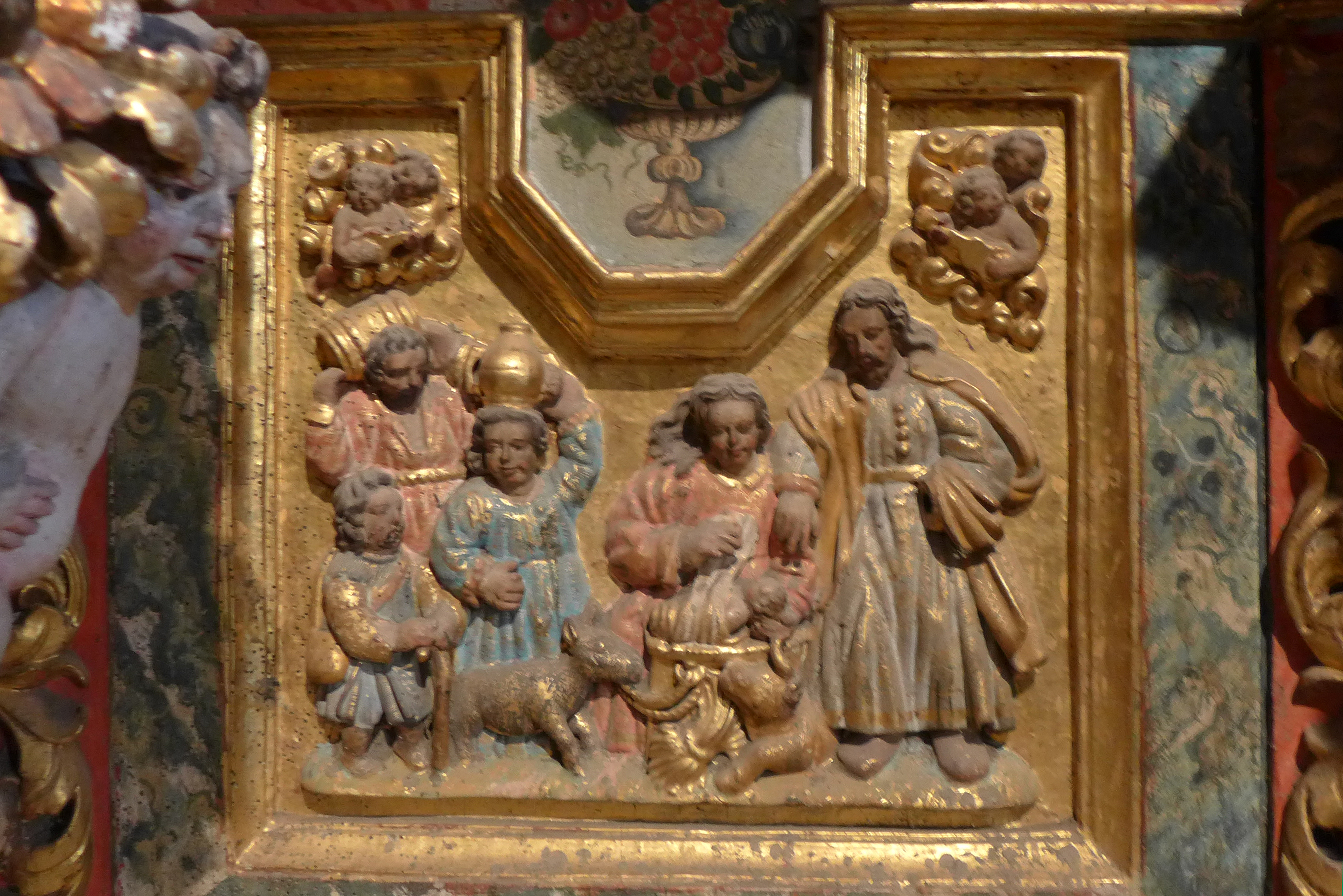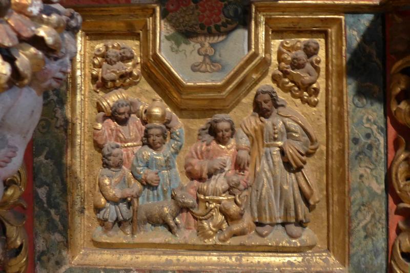 La Virgen y San José, en torno a un Niño tumbado, en pañales, con mula y buey miniaturizados, asisten a la llegada de tres pastores con presentes, uno de los cuales porta uno en un cántaro sobre la cabeza y otro en un tonelete sobre los hombros. En los extremos superiores, dos nubajes con querubines tañendo instrumentos de cuerda pulsada.