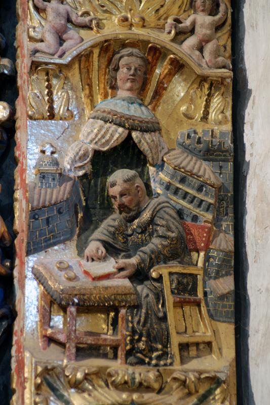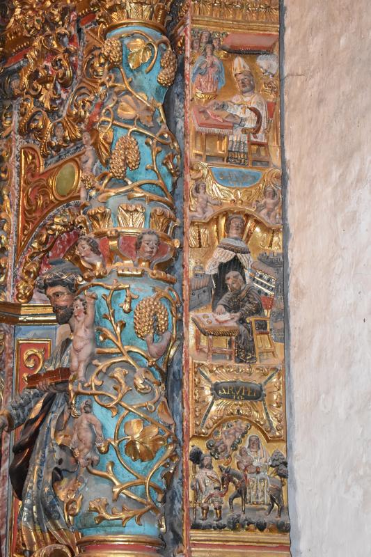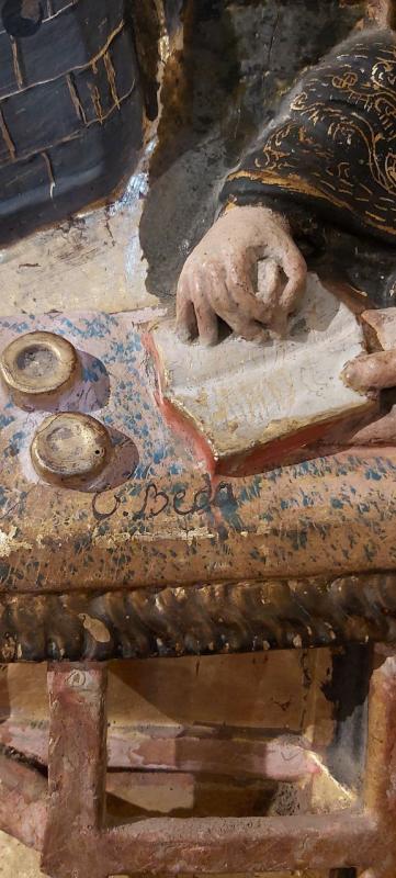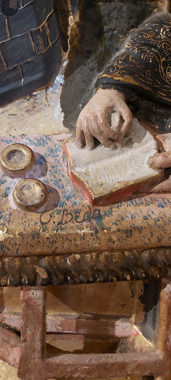 Pilar Hermosa, quien tiene a su cargo la visita y mantenimiento de la iglesia, nos facilitó en junio de 2022 una fotografía que realizó cuando estaba limpiando este retablo, en que se ve una inscripción manuscrita realizada por debajo de los tinteros y el libro que manuscribe el santo. Si bien se ha perdido la letra que compone la abreviatura, se lee: “[…]. Beda”. Puede ser una V de v[enerable], tratamiento con el que se le ha conocido históricamente, o una S de s[anto] cuyos trazos parcialmente se hayan borrado, opción que creemos menos probable.