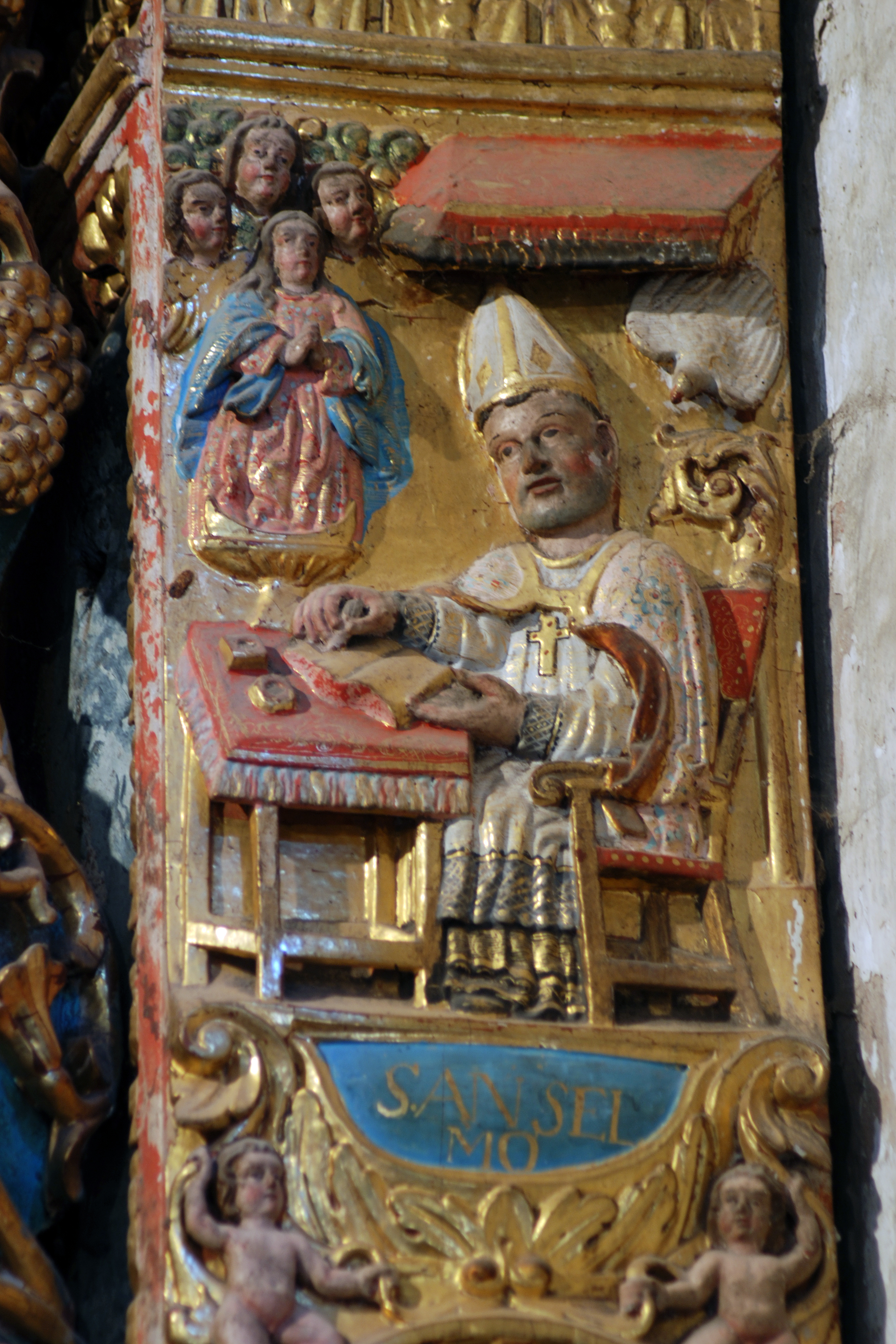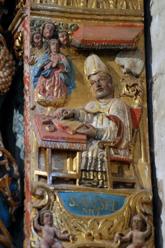 La letra de la inscripción es compatible con el periodo en que se hizo este retablo y, por tanto, sus relieves, si bien pudo realizarse en las décadas subsiguientes del siglo XVIII. No parece ser una indicación del taller a la hora de identificar al titular de la escena que trataba de representarse, puesto que el letrero se sitúa por encima de la policromía. Quizá un monje, ante las dudas que le presentaba la identificación con San Ruperto, lo relacionó con el benedictino inglés que vivió a caballo entre los siglos VII y VIII, autor de una importantísima obra escrita, y bien conocido en Europa y la península ibérica durante la Edad Media. No obstante, el personaje que le acompaña carecería de sentido.