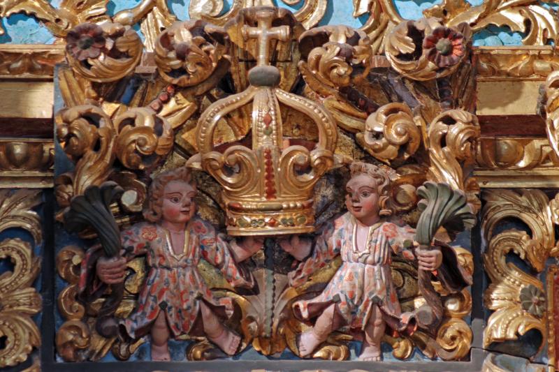Dos niños afrontados, con vestidos estampados, escote en V y falda recortada formado tres picos sostienen con una mano una gran corona central dorada de tipo imperial, mientras con la otra sostienen cornucopias vegetales.